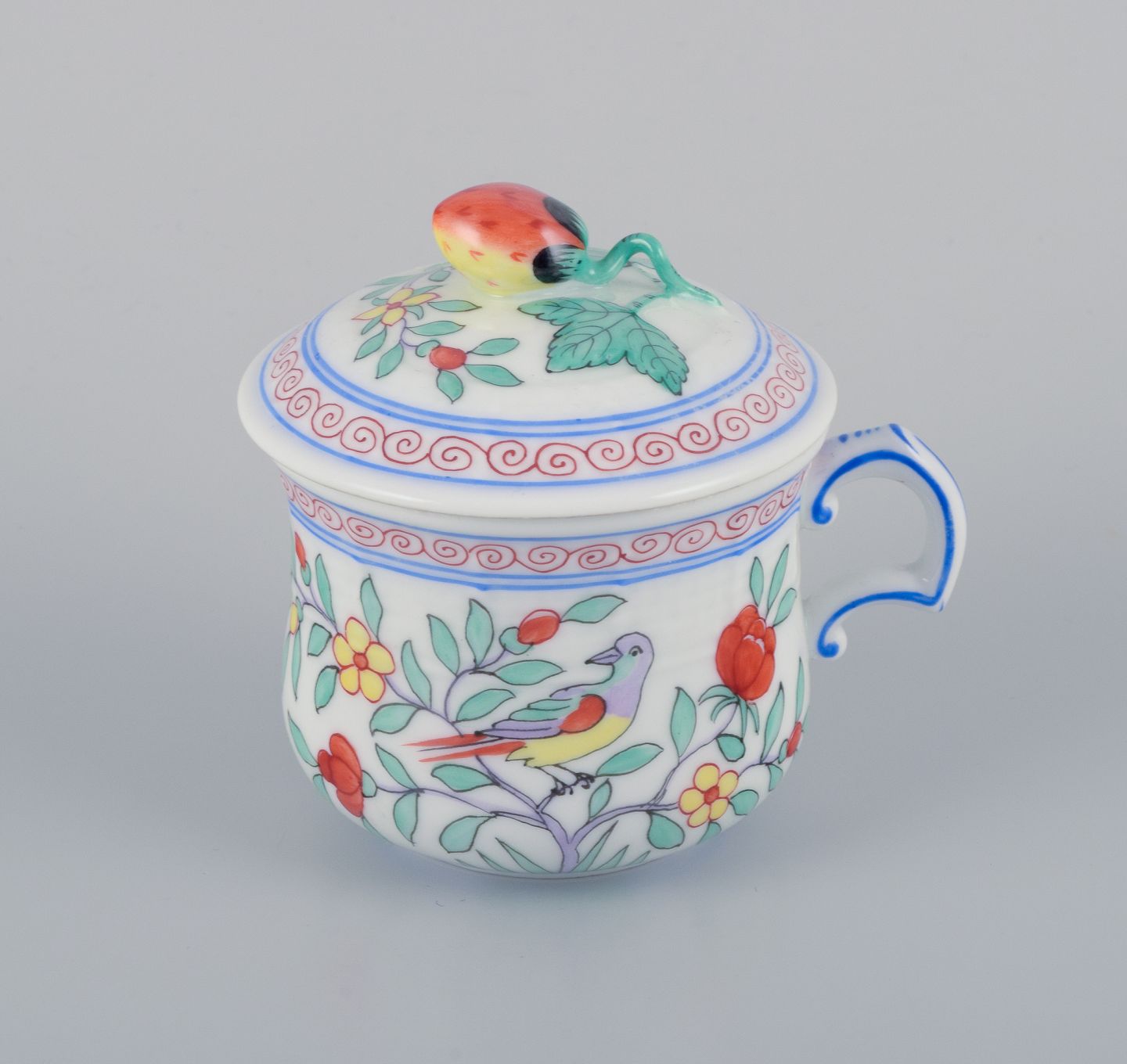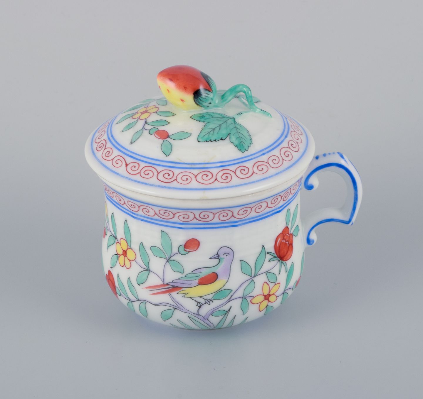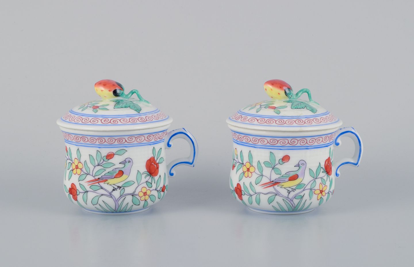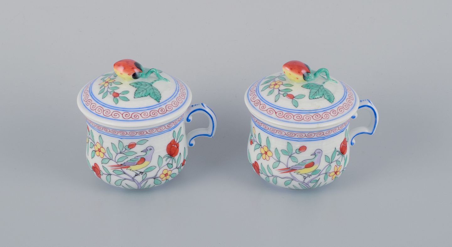 Text zugänglich auf Dänische: Herend, Ungarn, to bouillonkopper i porcelæn, håndmalet med blomster og fugle.