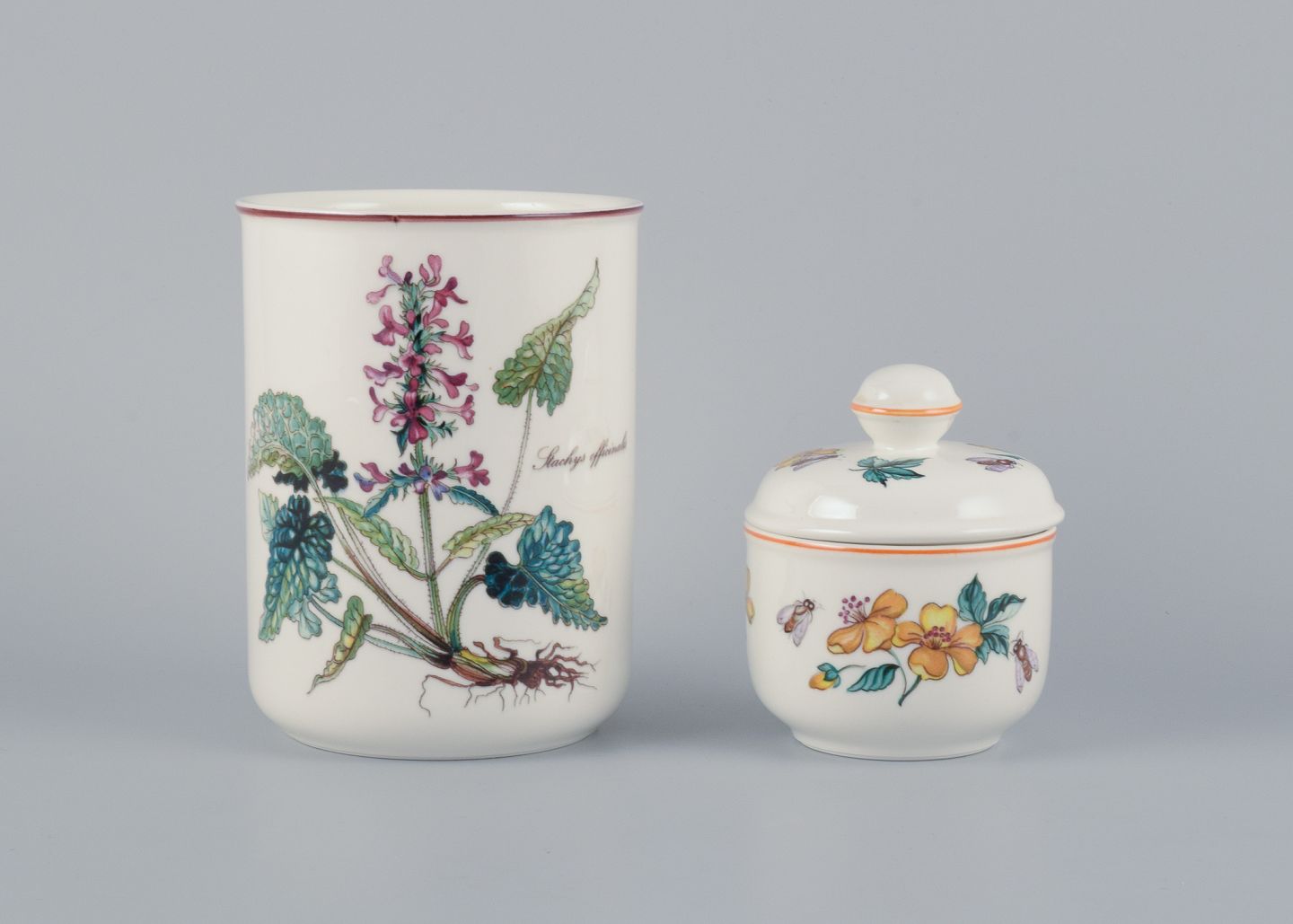 Villeroy & Boch, to dele ”Botanica”, porcelænsvase og sukkerskål dekoreret med blomster og bier.