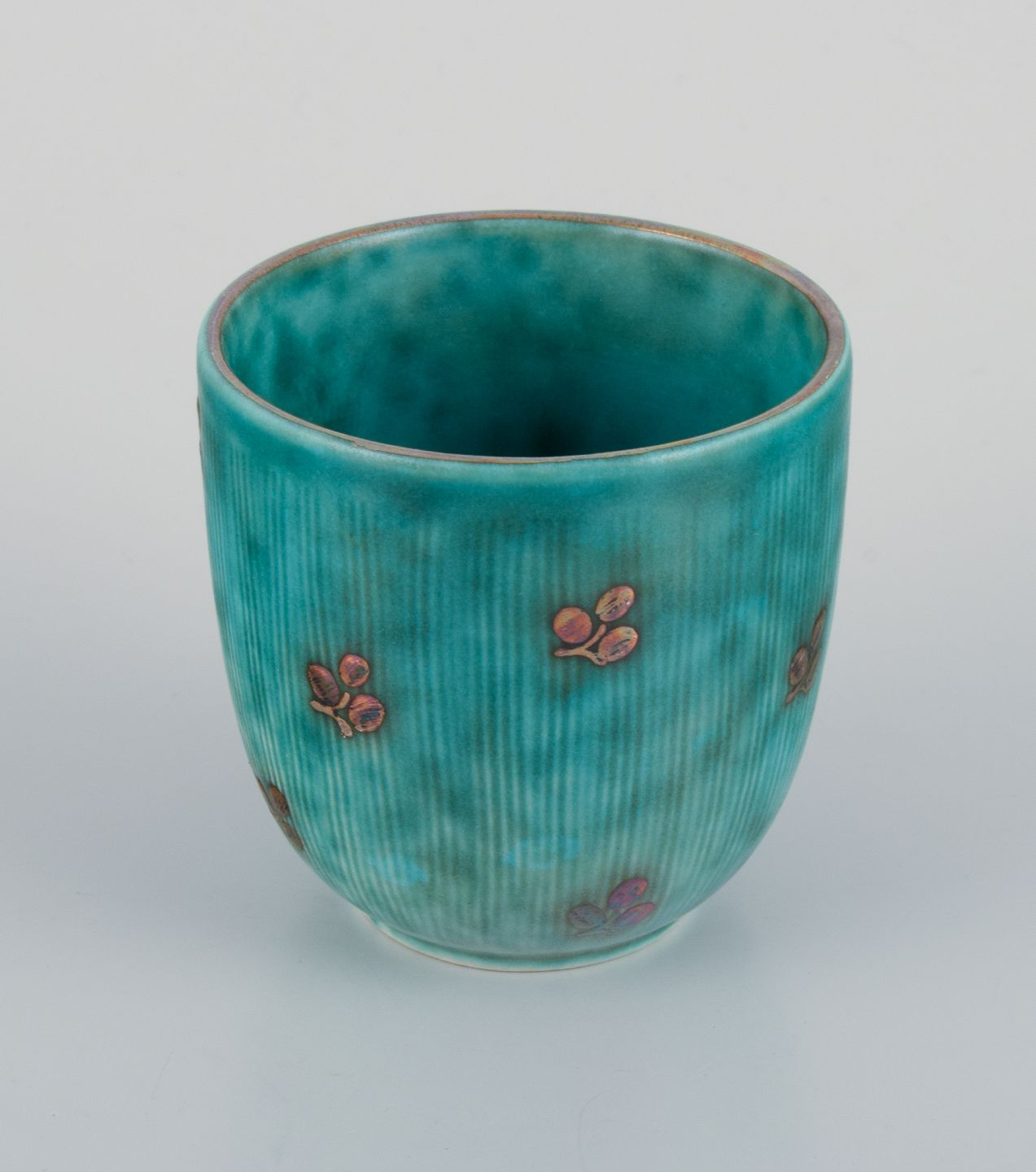 Wilhlem Kåge for Gustavsberg, Tre små ”Argenta” keramikvaser. Glasur i grønne toner med blade i for af sølvindlæg.