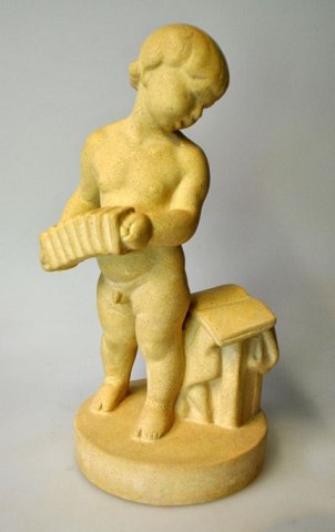 Dänischer Künstler (20. Jahrhundert): Ein Junge mit Akkordeon und Noten. Künstlicher Stein. Signiert: Monogramm. Höhe: 29 cm. Vermutlich Holger Jensen.