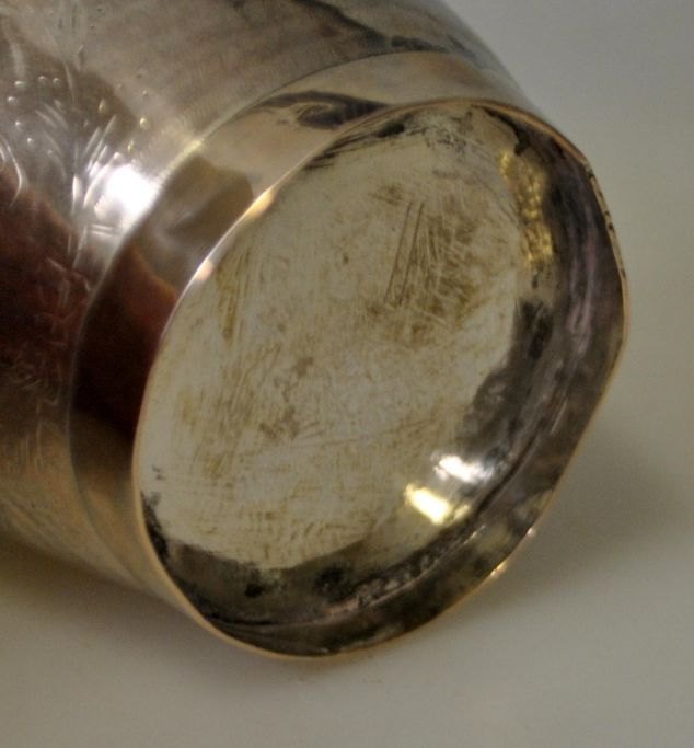 Dansk barok drikke bæger, 1839. Konisk. På siderne graveringer med bladværk , streger og initialer: M.C.D/N.G 1839 og J.N.S.J 1841. H.: 6,7 cm. Ustemplet.  NB: Bægeret har fået en nyere standrand! Proveniens: Familien Hingelberg, Aarhus.