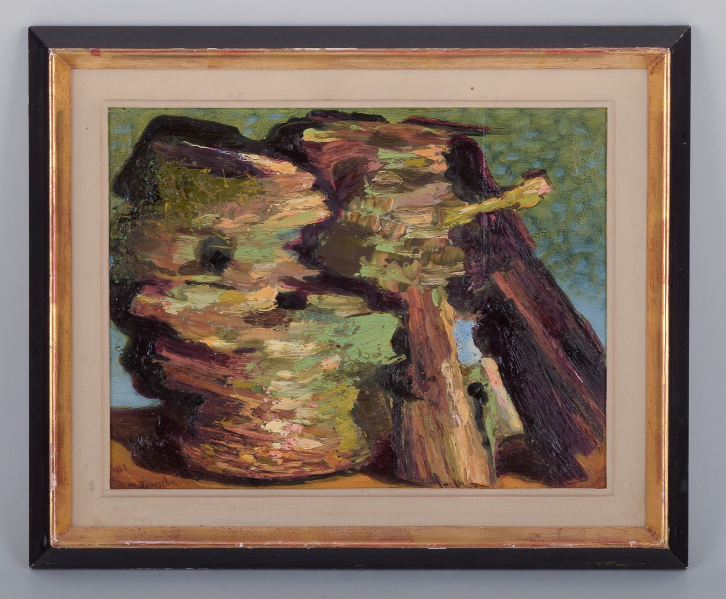 Text zugänglich auf Dänische: Michael Qvarsebo, født 1945, svensk kunstner, olie på plade. Abstrakt komposition med pastose strøg. Koloristisk palette.