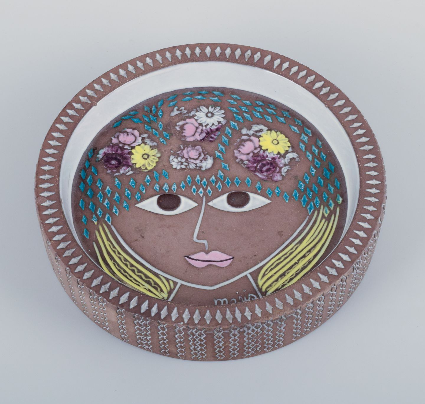 Text zugänglich auf Dänische: Mari Simmulson for Upsala Ekeby, Sverige, keramikskål i modernistisk stil med motiv af kvindeansigt.