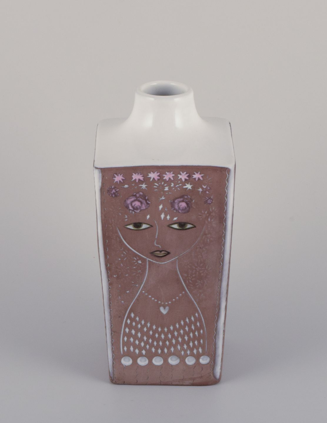 Text zugänglich auf Dänische: Mari Simmulson for Upsala Ekeby, Sverige. Keramikvase i firkantet form. Blomster og kvindemotiv.