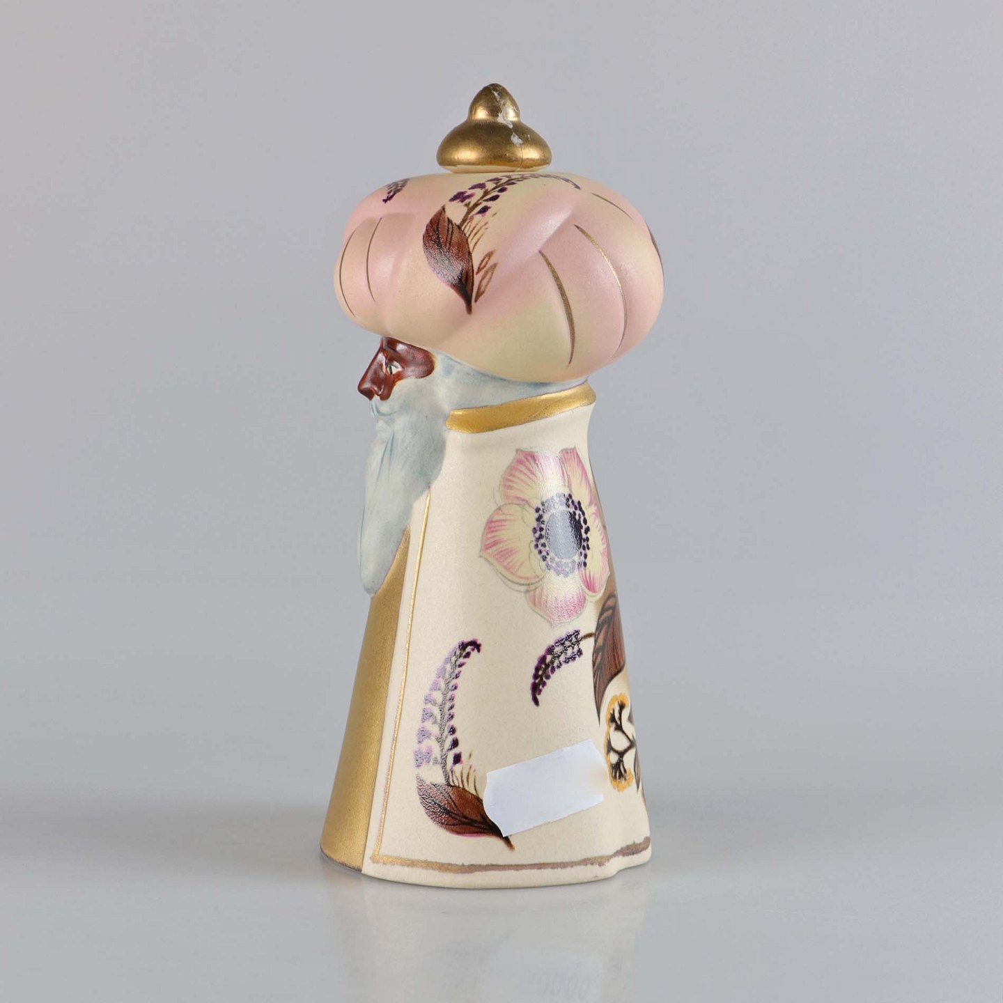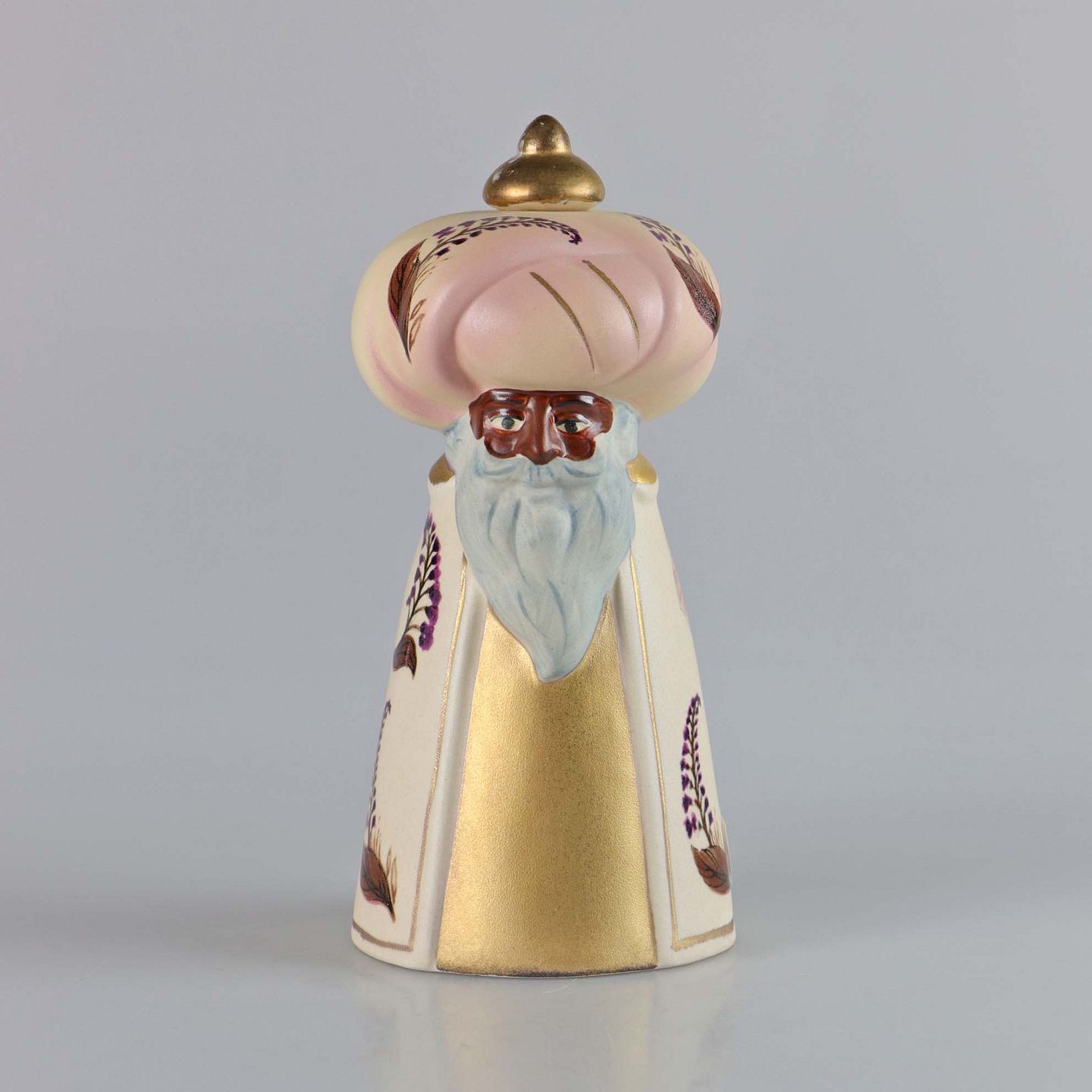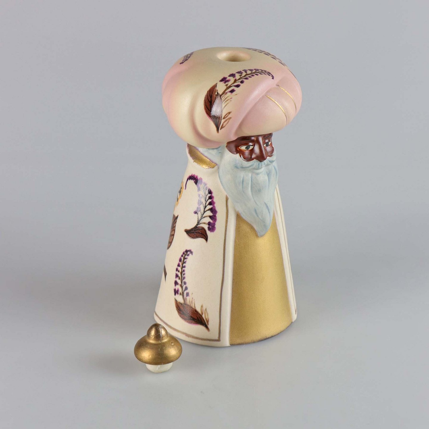 Figur i porcelæn. Melchior fra De tre vise mænd. Når guldknoppen tages af, er der hul til et kerte lys