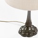 Table lamp in patinated metal with light shade.