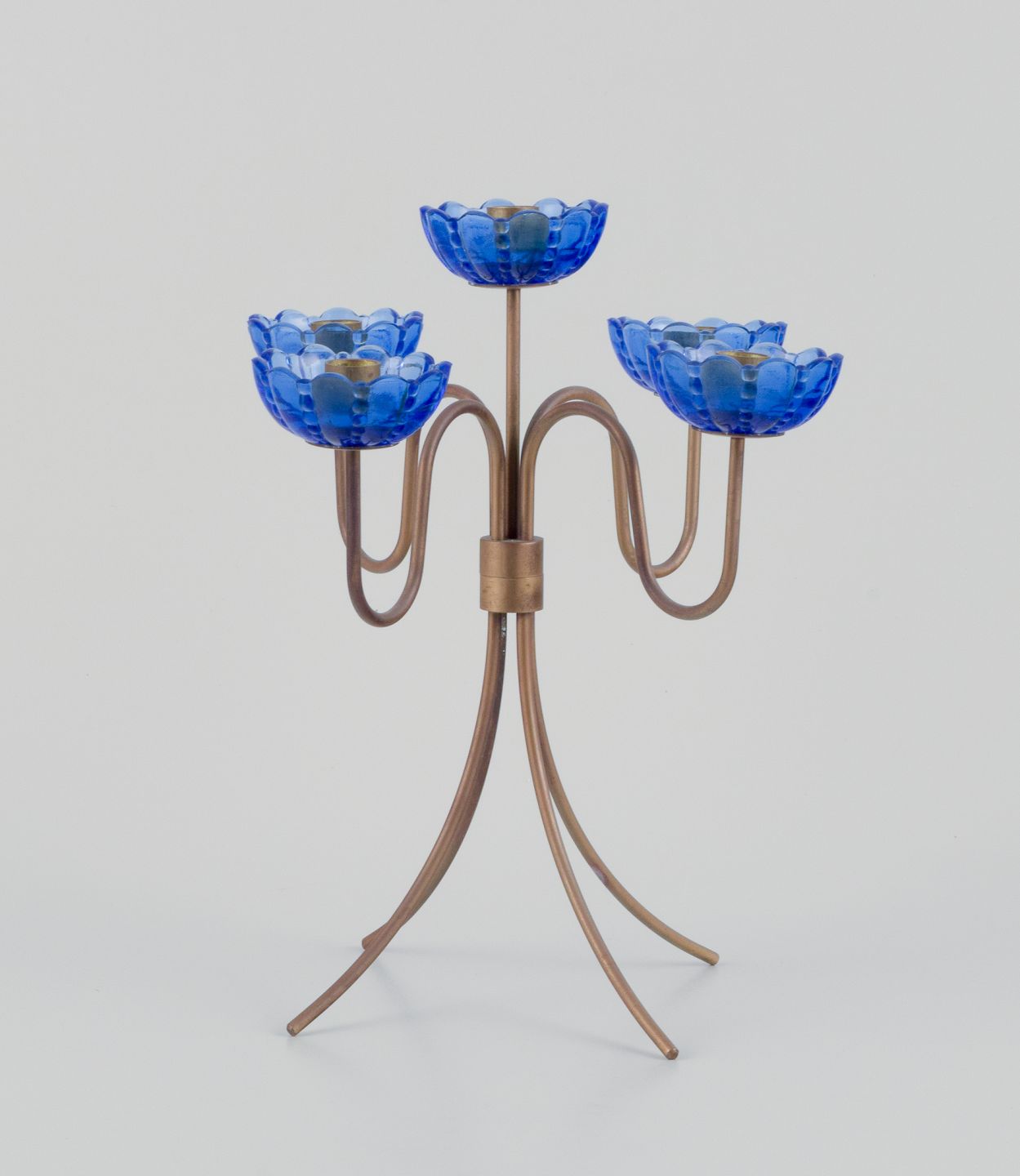 Text zugänglich auf Dänische: Gunnar Ander for Ystad Metall, Sverige. Høj lysestage i messing og blåt kunstglas formet som blomster. Til fem lys.