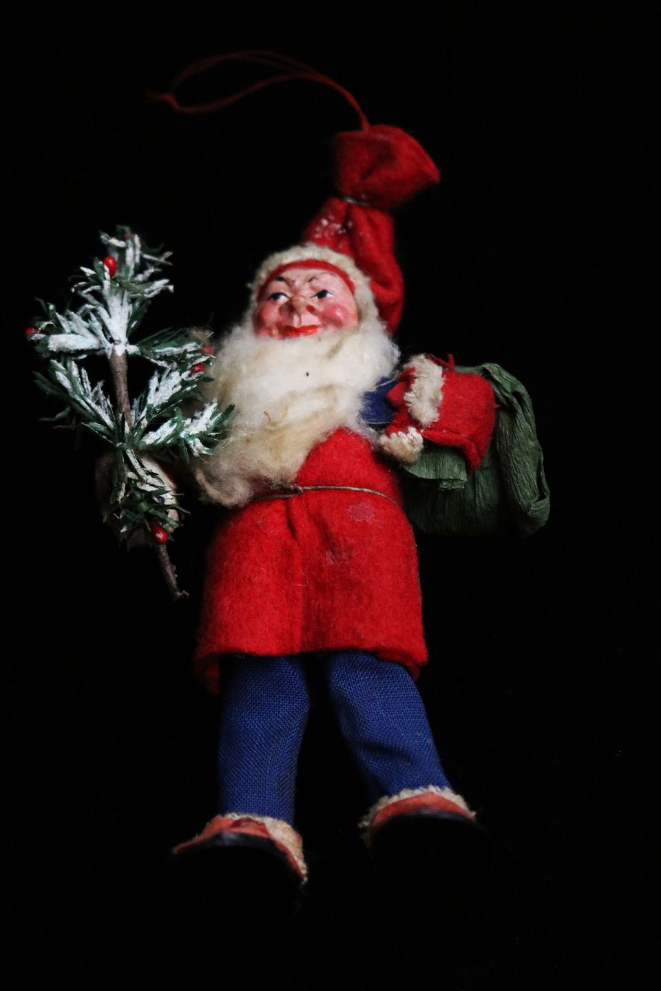 Fint , gammelt julepynt til juletræet i form af julemand fra 40 / 50érne i filt , papir og vat...