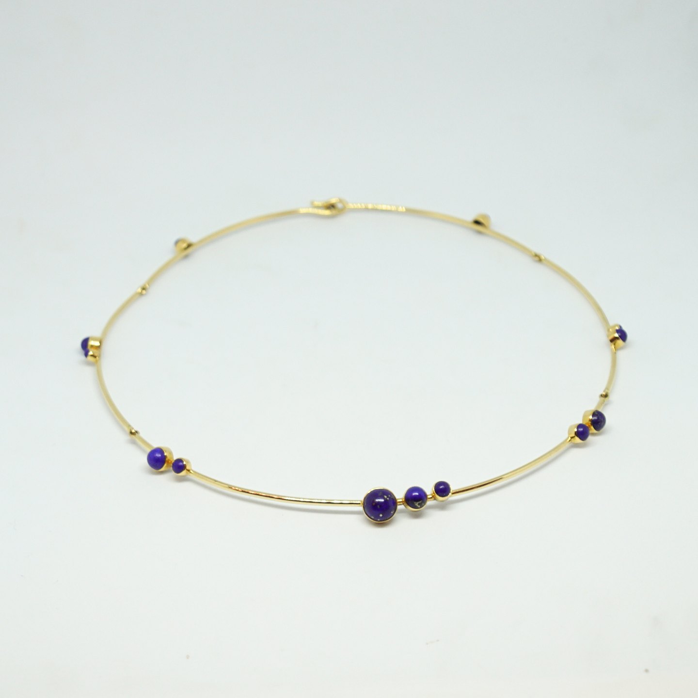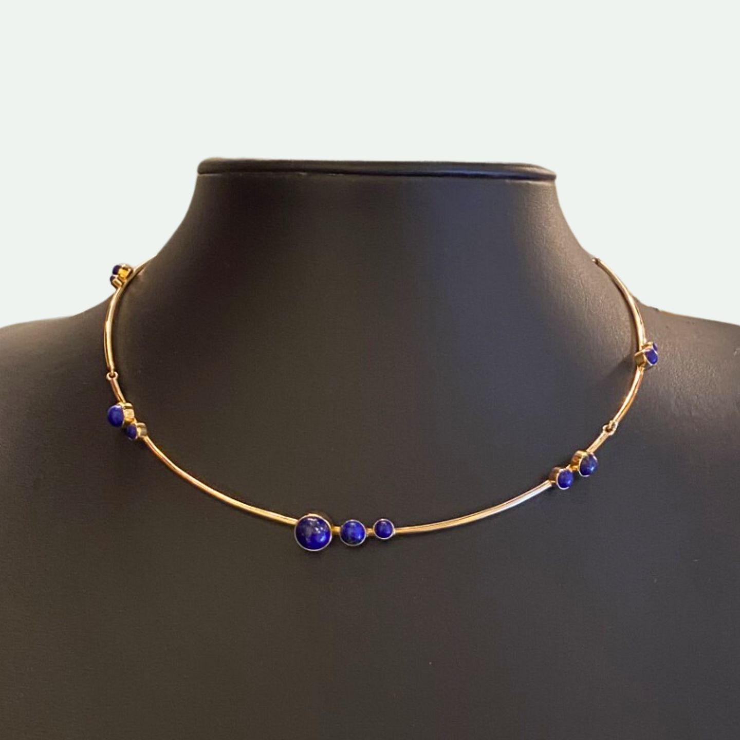 Karen Strand; Leddelt halsring i 14 kt. guld, prydet med Lapis Lazuli. Sammensat af 5 led.