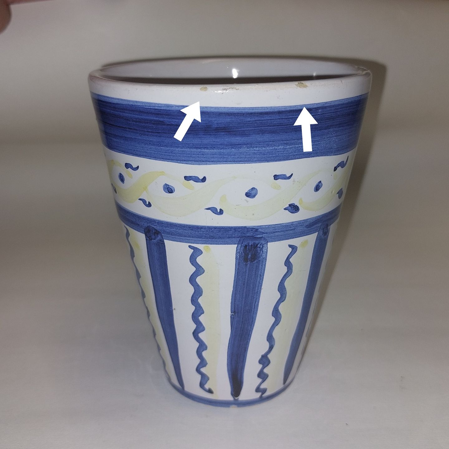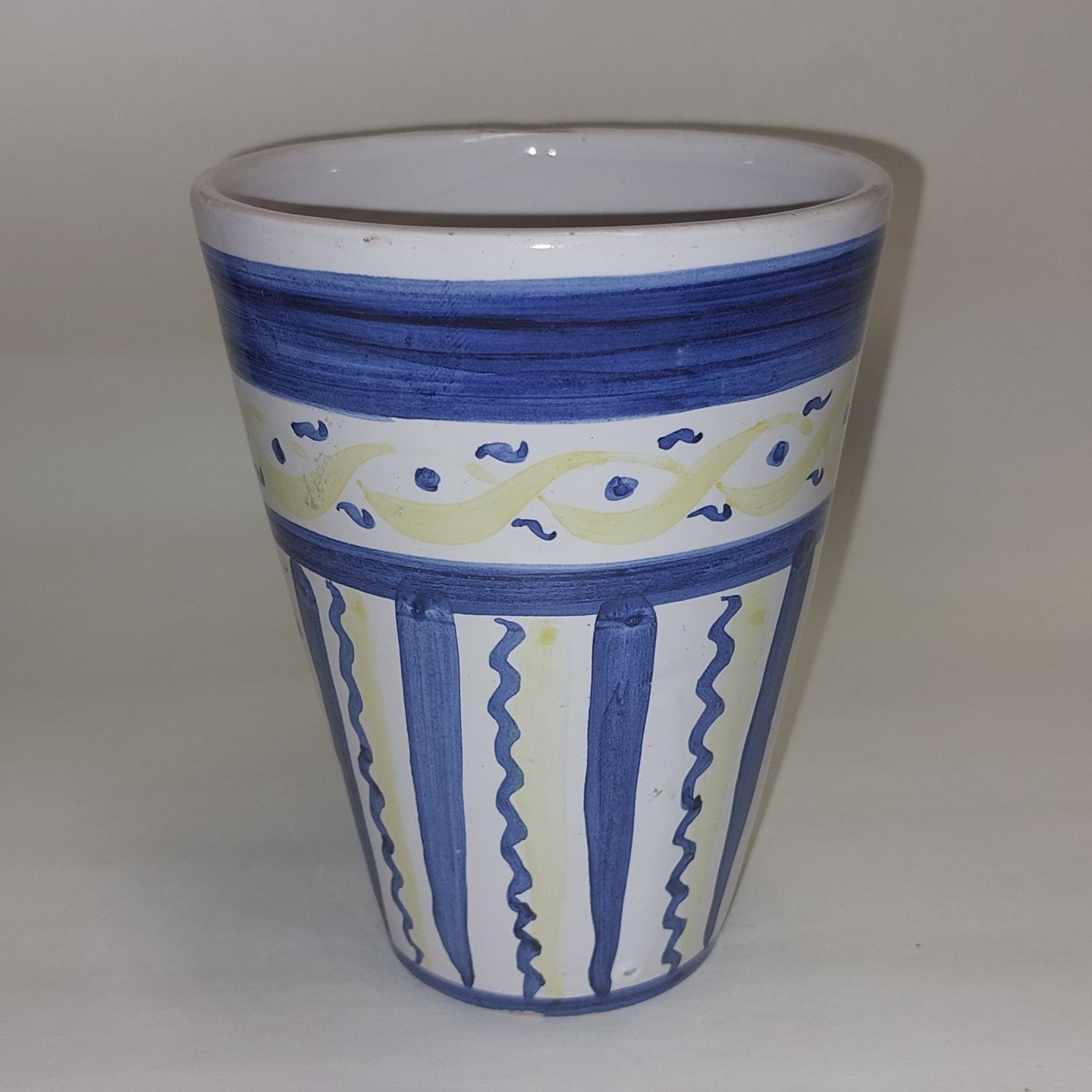Bæger eller vase i keramik. Håndmalet dekoration. Har brugsspor på kantem i form af mindre skår og glasurafslag (se fotos). Håndmalet fabrikslogo samt signatur på bunden. Mål: H. 14 cm.Ø. 11 cm