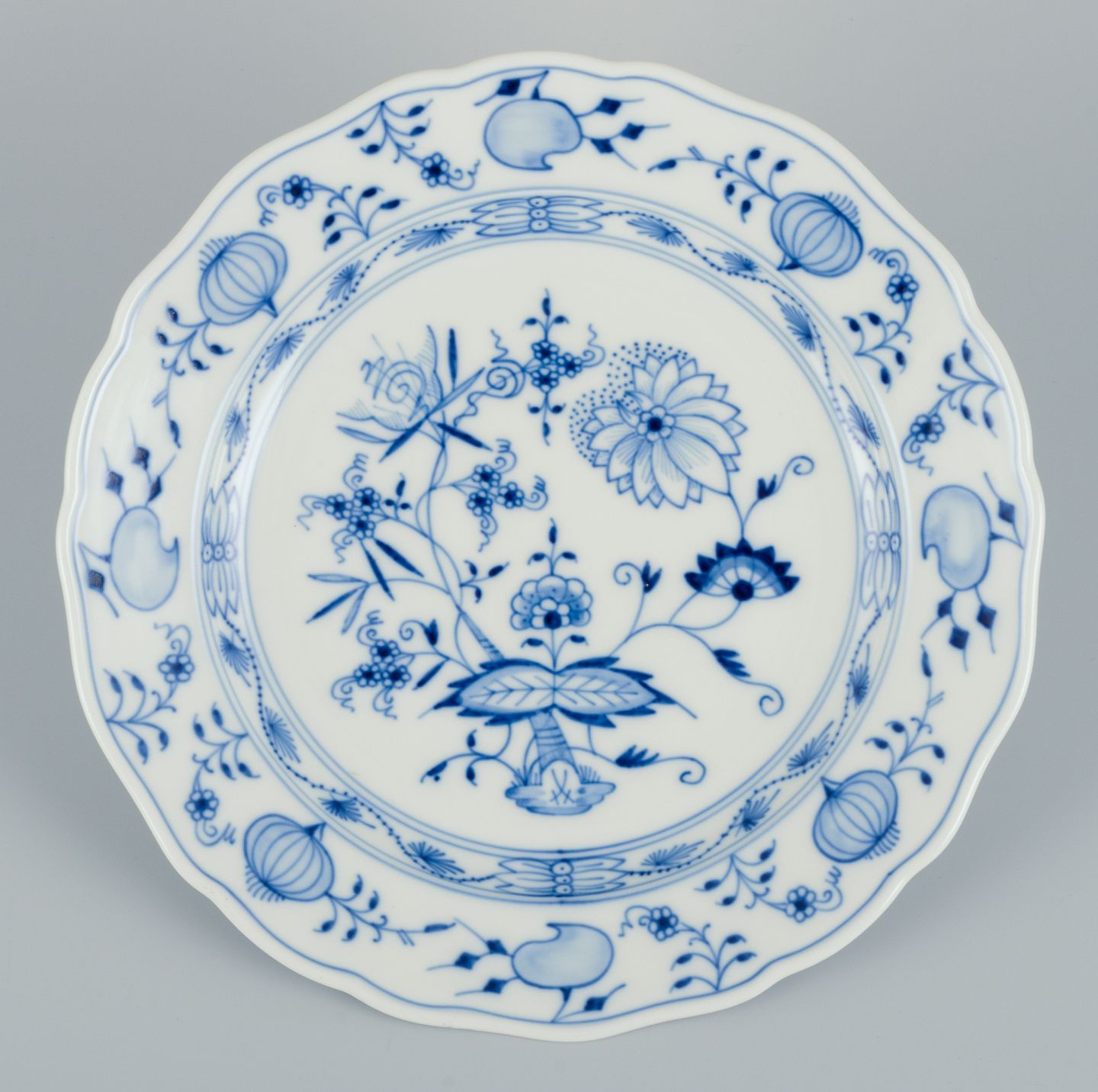 Meissen, Tyskland. Et sæt på fire Løgmønstret middagstallerkner i porcelæn. Håndmalet.
