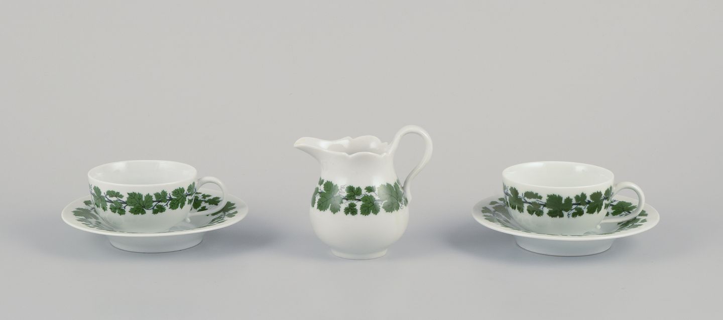 Meissen, Tyskland, Green Ivy Vine, to kaffekopper med tilhørende underkopper samt flødekande. Håndmalet.