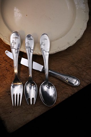 Gammelt barnebestik (4 dele) i 3 tårnet sølv med H. C. Andersen motiv af "Ole lukøje"...