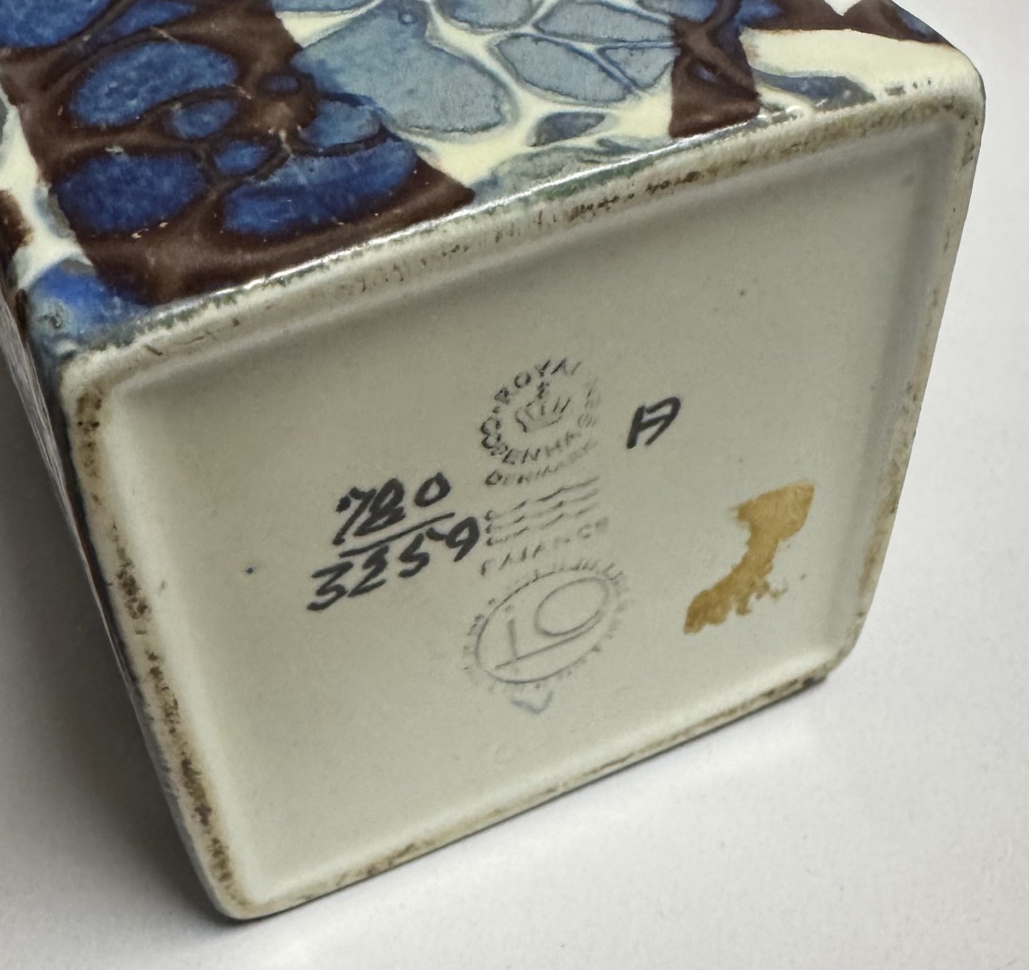 Johanne Gerber: Firkantet vase i fajance fra Aluminia fabrikken med modelnummer 3259. I god stand. 1. Sortering. H. 22,2 cm.