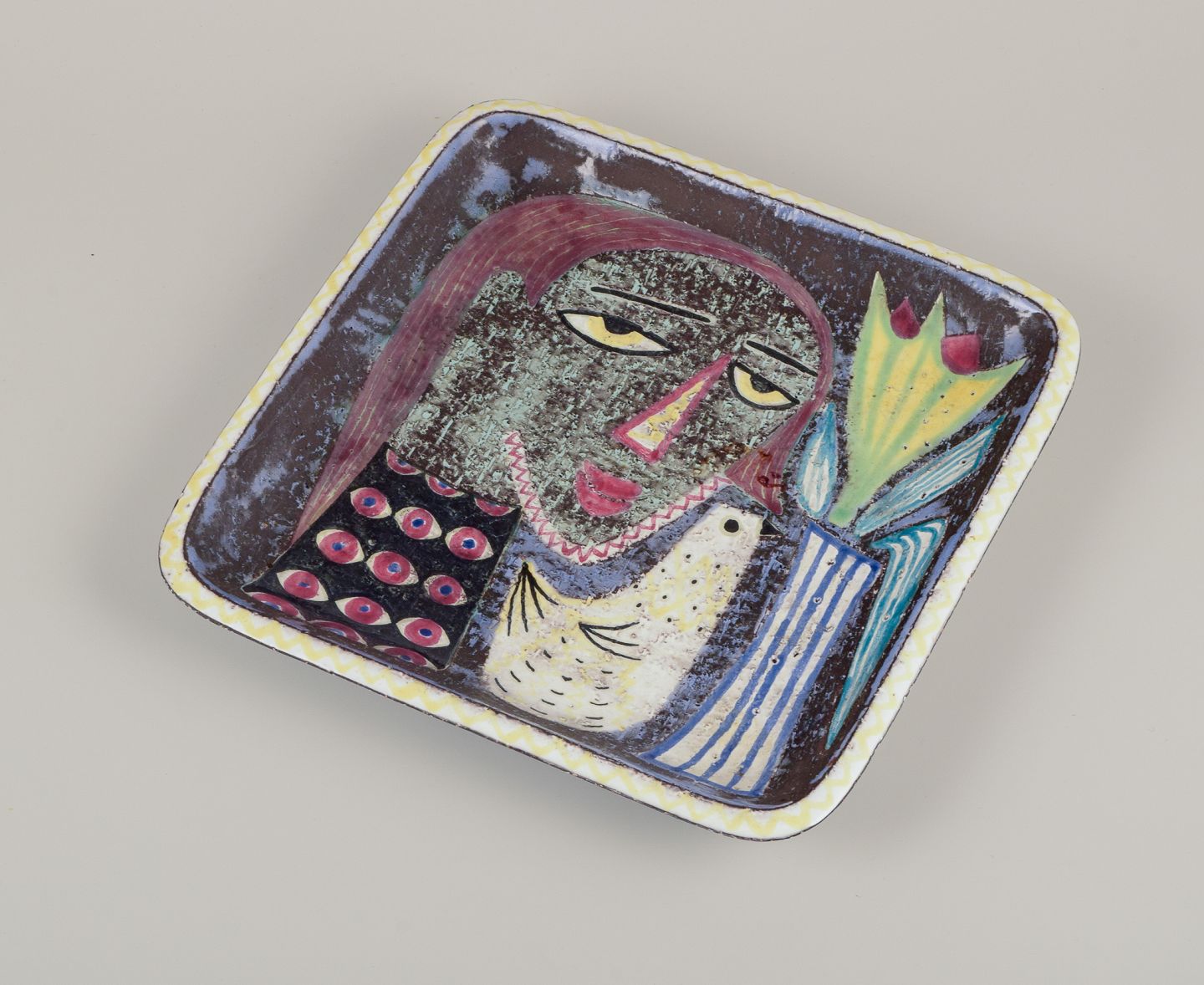 Text zugänglich auf Dänische: Mari Simmulson (1911-2000) for Upsala Ekeby. Stor keramikskål. Hånddekoreret med motiv af fugl, blomster i vase og kvindeansigt.