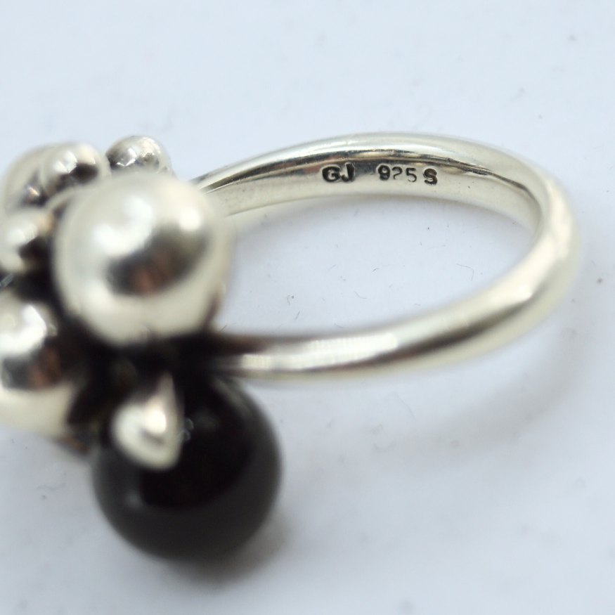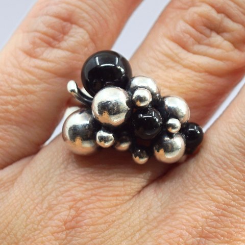 Text zugänglich auf Dänische: Georg Jensen; Moonlight Grapes ring i sterlingsølv med sorte onyx kugler. Ring str. 52.