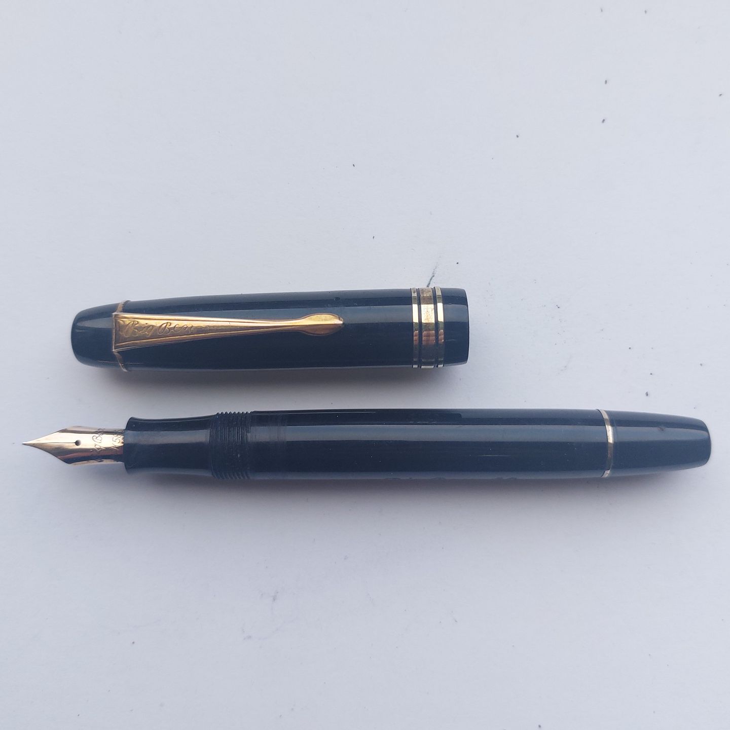 Big "Cigar": Black Big Ben 40 fountain pen. Push button ink filler. Appears in good condition. All parts original Big Ben parts including a fine 585 gold nib. Does not work. A new rubber sac must be inserted before it can again absorb ink and write again. The fountain pen is 13.8 cm long.
