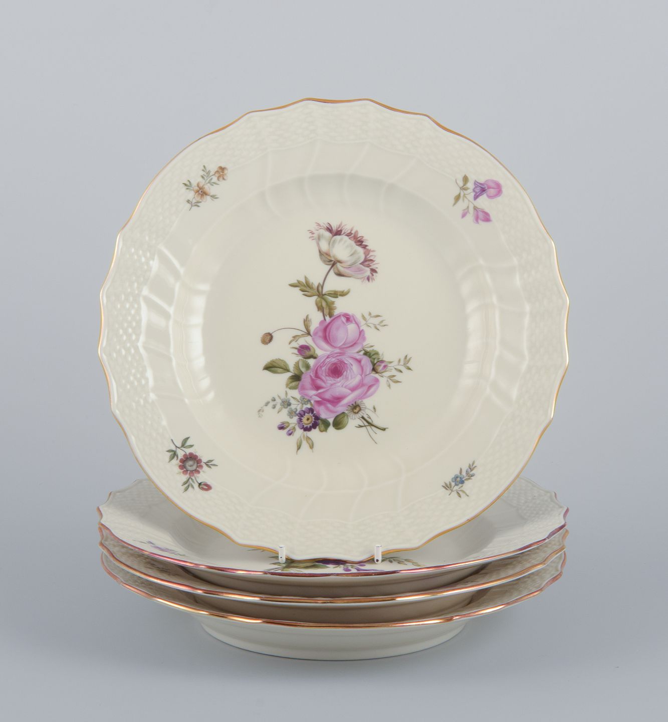 Text zugänglich auf Dänische: Royal Copenhagen ”Frijsenborg”. Fire middagstallerkener i håndmalet porcelæn med blomster og guldkant.