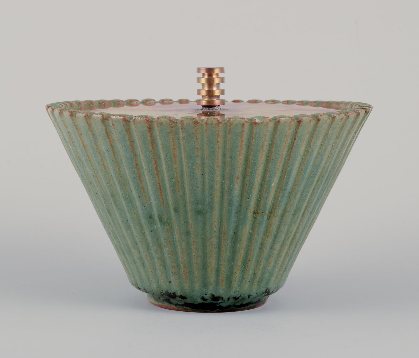 Text zugänglich auf Dänische: Arne Bang. Keramikvase med låg i patineret messing.