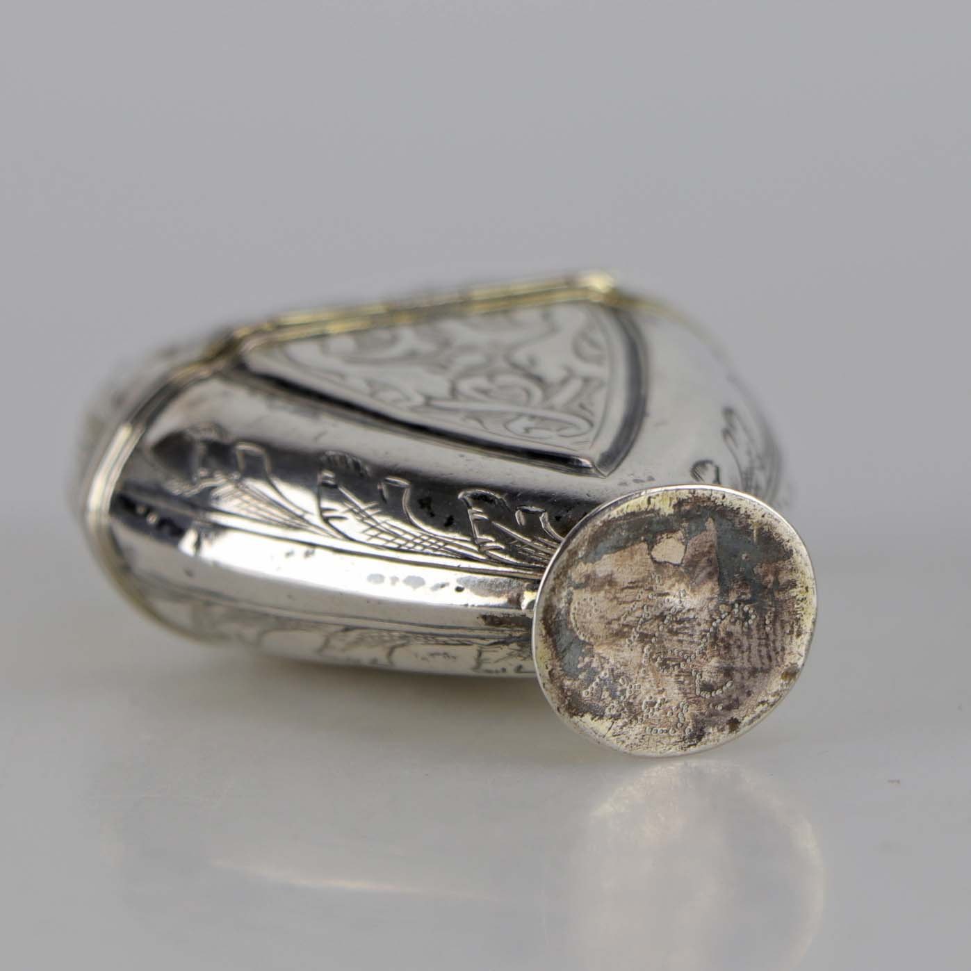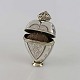 Text zugänglich auf Dänische: Antik hjerteformet hovedvandsæg i sølv med krone og abstrabt mønster. Ægget indeholder en svamp og er graveret under bunden med teksten 1793 M.L.