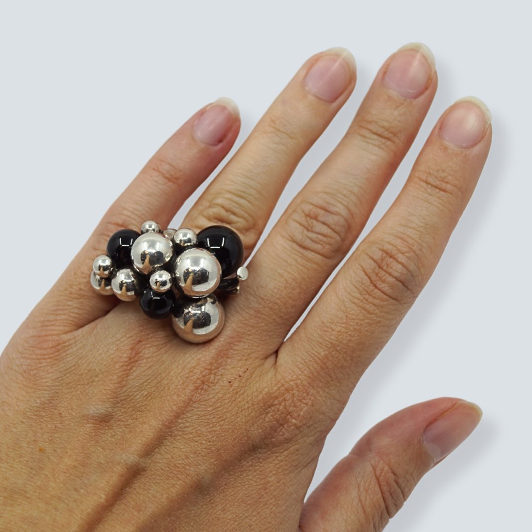 Text zugänglich auf Dänische: Georg Jensen; Stor Moonlight Grapes ring i sterlingsølv med sorte onyx kugler, large. Stemplet ring str. 50, men ringskinnen er justeret til at passe omkring str. 55-56.