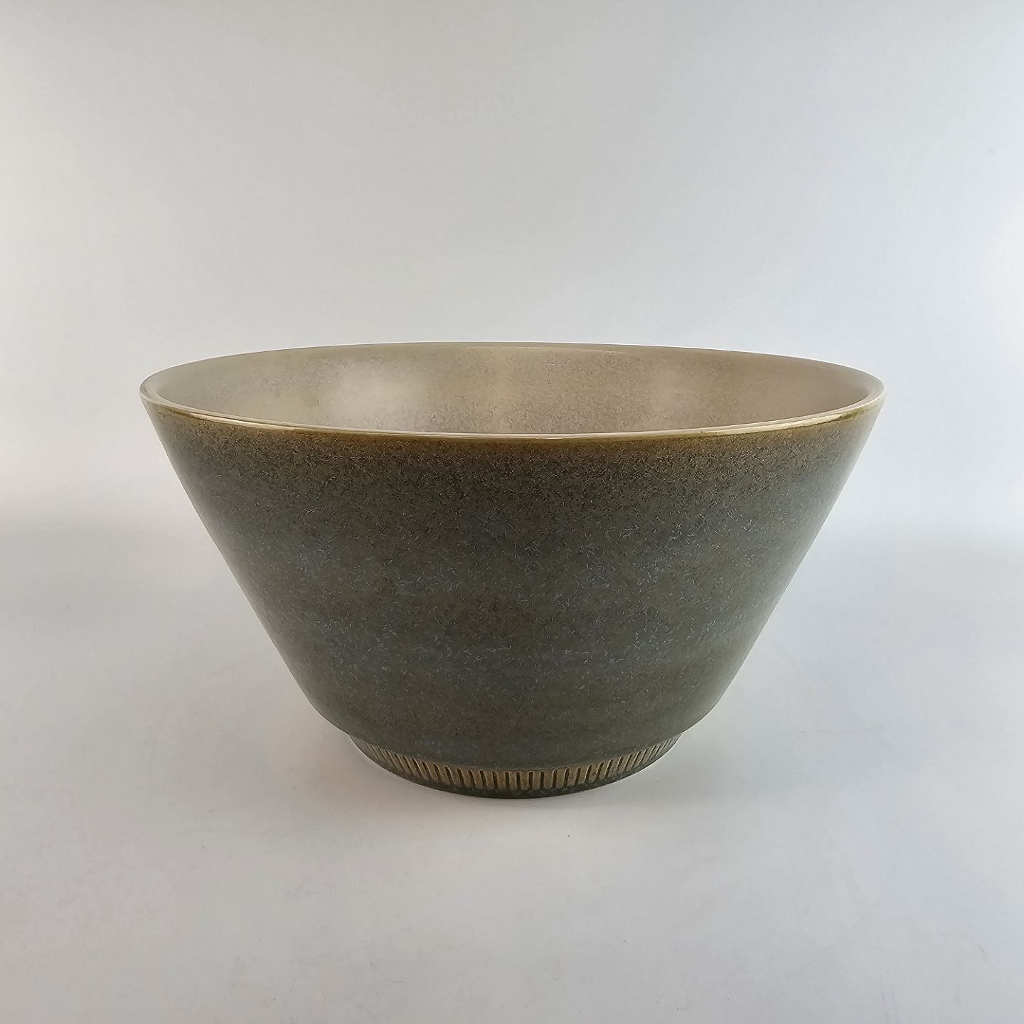 Text zugänglich auf Dänische: Skål af stentøj og dekoreret med en grønlig nuancefarvet glasering.