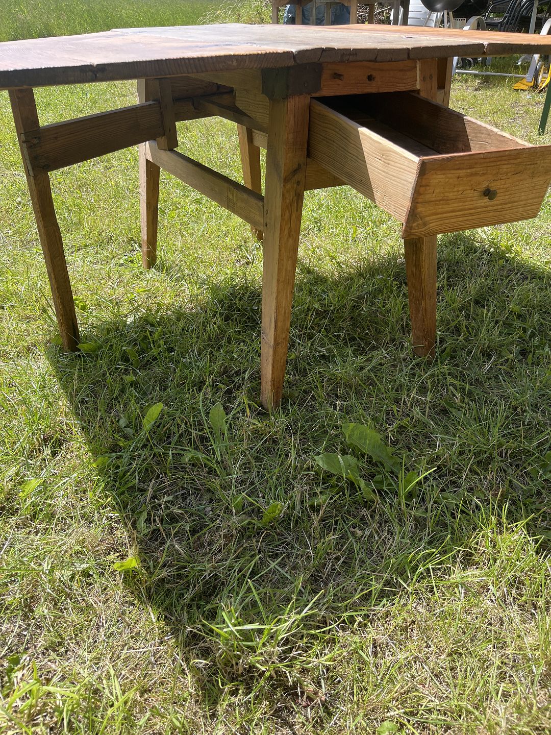 Gammelt Klapbord i Massiv fyrtræ. Det har brugsspor.