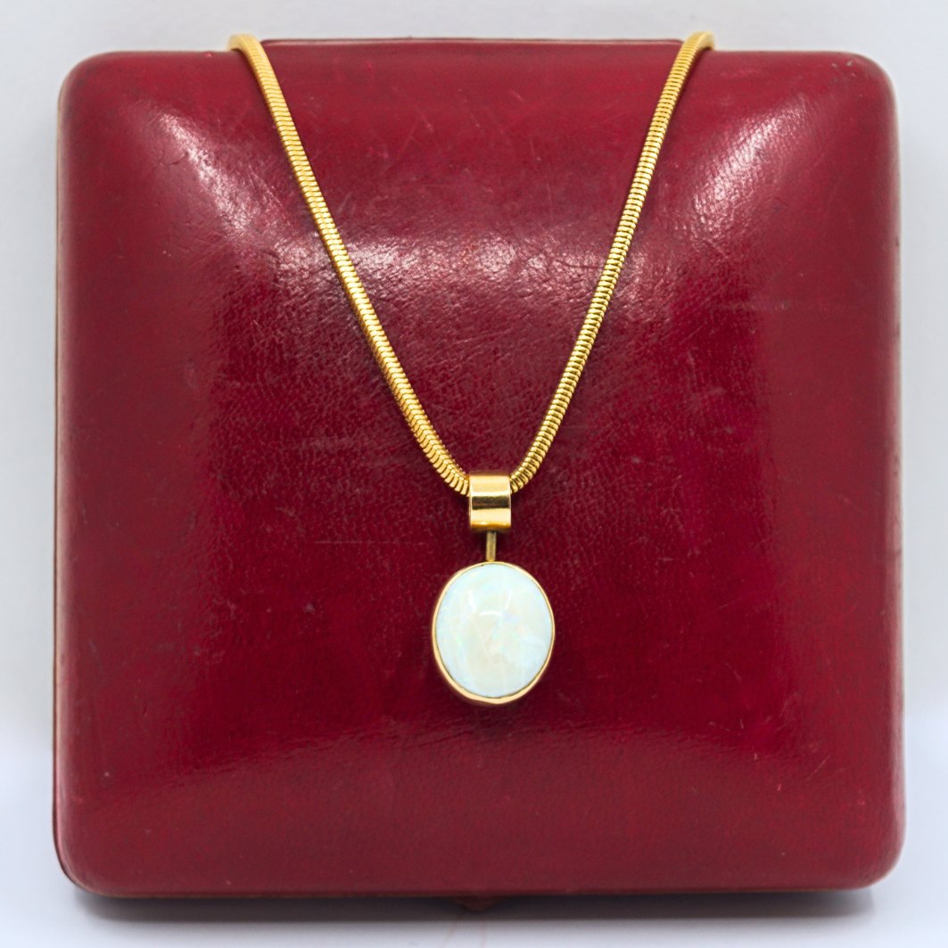 Text zugänglich auf Dänische: Halssmykke i 18 kt. guld prydet med stor opal. Vedhænget kan drejes i øskenet, dvs. der er opal på begge sider. Vedhæng med øsken h. 2,7 cm, opal h. 1,7 cm. B. 1,4 cm. Halskæde l. 48 cm.