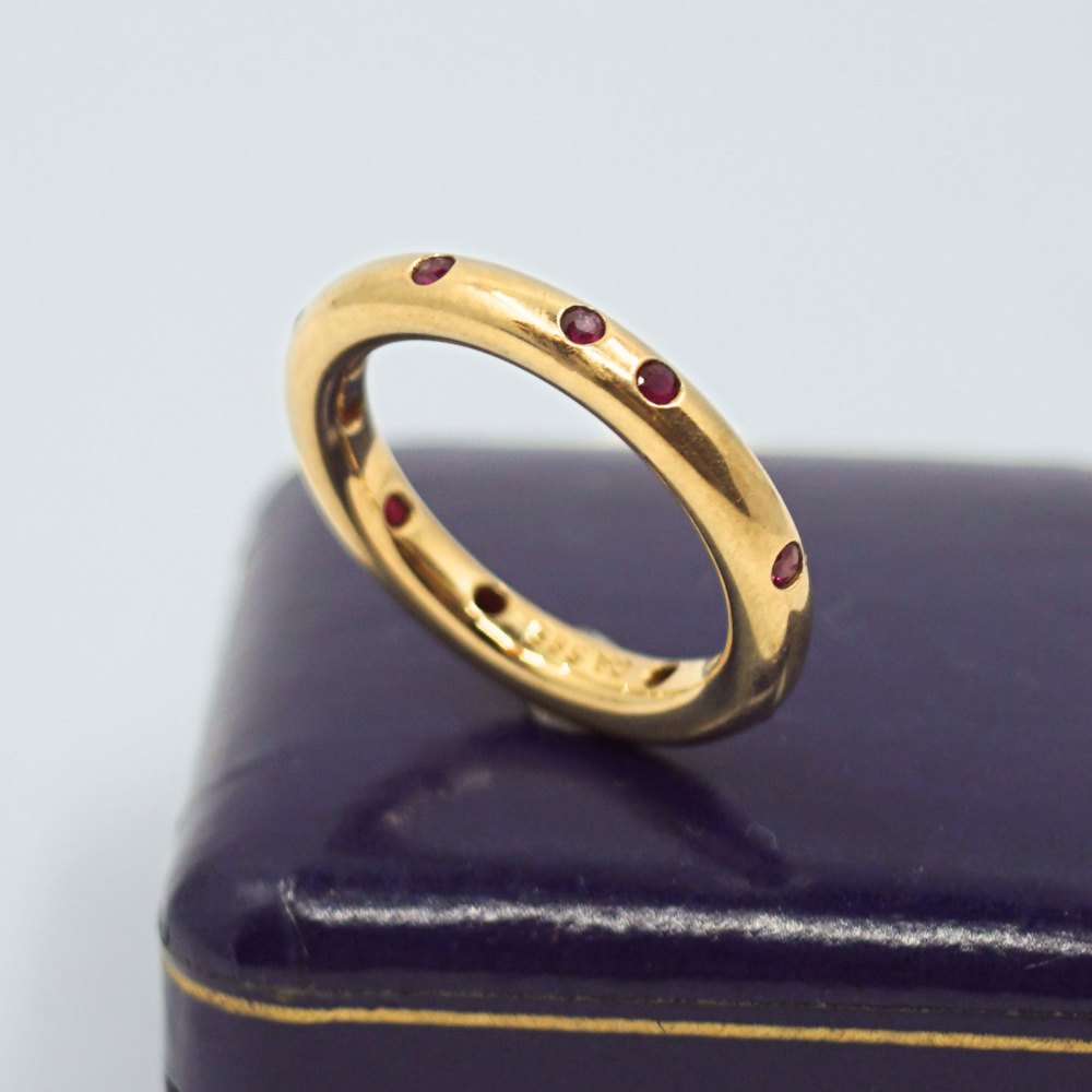 Text zugänglich auf Dänische: Carl Antonsen; Ring i 14 kt. guld, prydet med rubiner. Ring str. 52. Stemplet "CA 585".