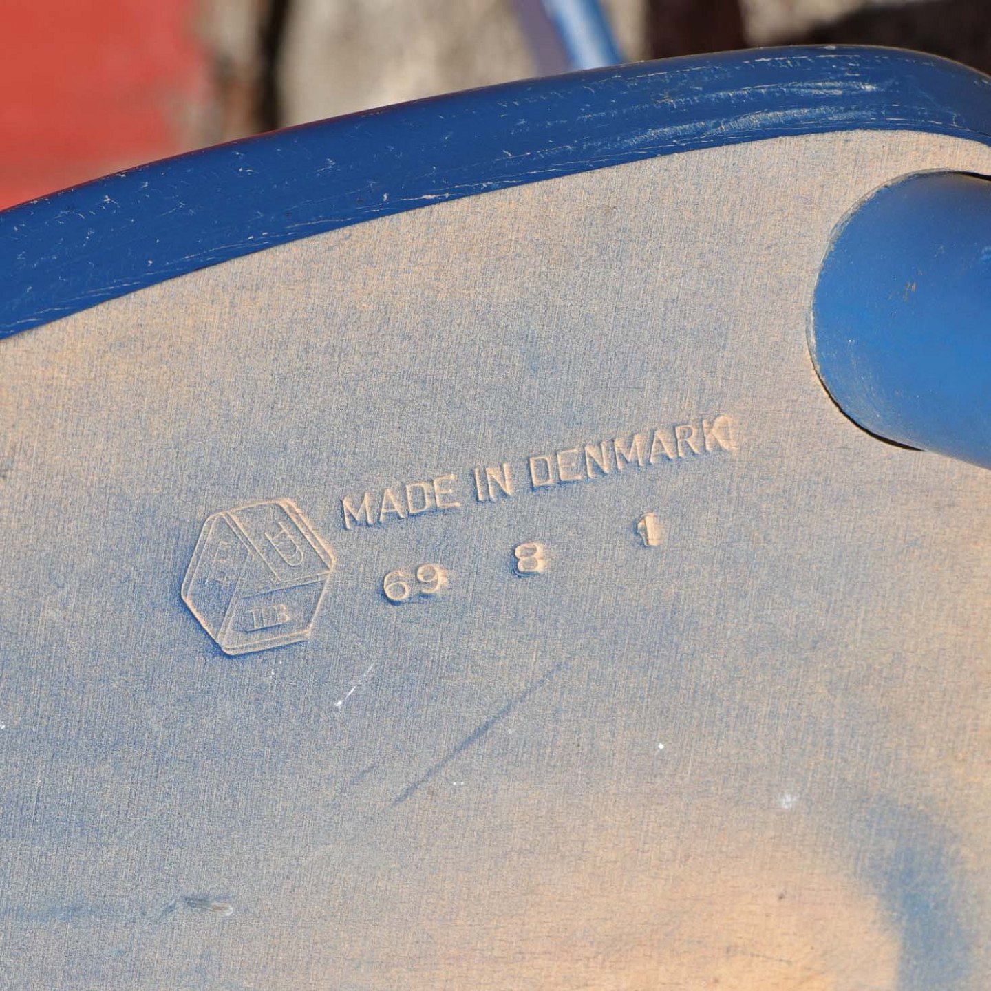 Text zugänglich auf Dänische: Møbelsæt bestående af trekantet spisebord model C 51 og tre spisebordsstole med trekantet sæder model J 107. Sættet har et blåmalet stel og bordet er med mørk bordplade.