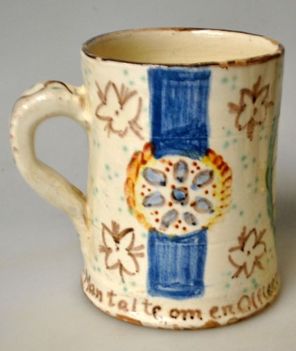 Andersen-Høyer, Kay (20. Jahrhundert) / Anders Høy, Dänemark: Becher. Polychrom bemaltes Ton. Handbemalte Dekoration in Form eines Offiziers und einer nackten Frau. Mit dem Text: „Sie sprachen über einen Beamten – der im Kvarter gelegen hatte“. Signiert: Anders Høy 1936. H.: 11,8 cm.