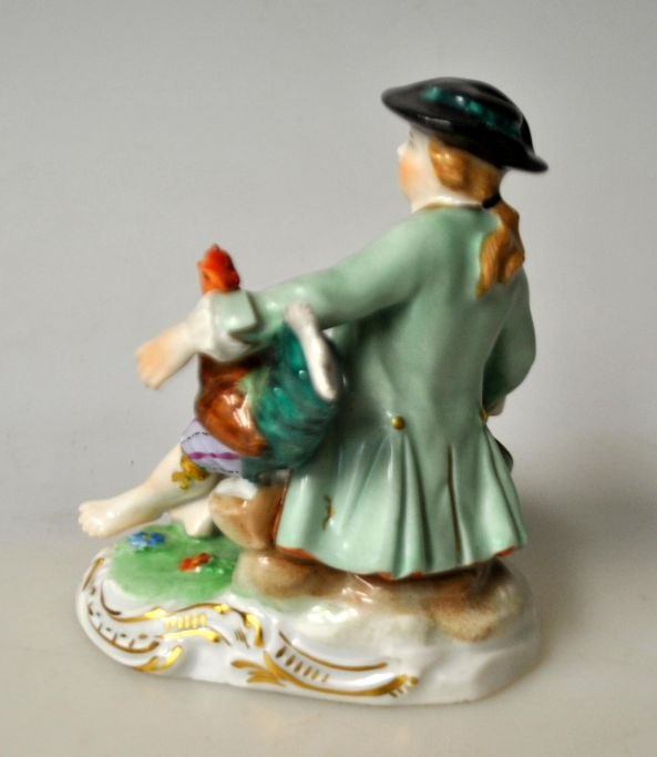 Porzellanfigur Bauernjunge mit Hühnern, Potschappel, Dresden, Deutschland.