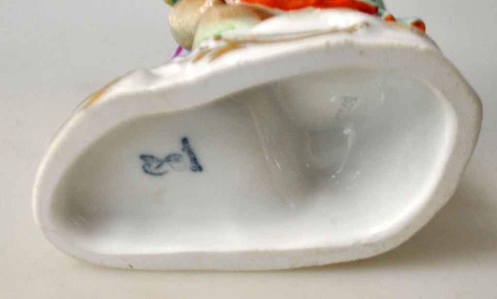 Porzellanfigur Bauernjunge mit Hühnern, Potschappel, Dresden, Deutschland. 20. Jahrhundert. Bemalt und vergoldet. H: 11 cm. B: 6 cm. L: 9,5 cm. Gestempelt: SP Dresden 5908D.