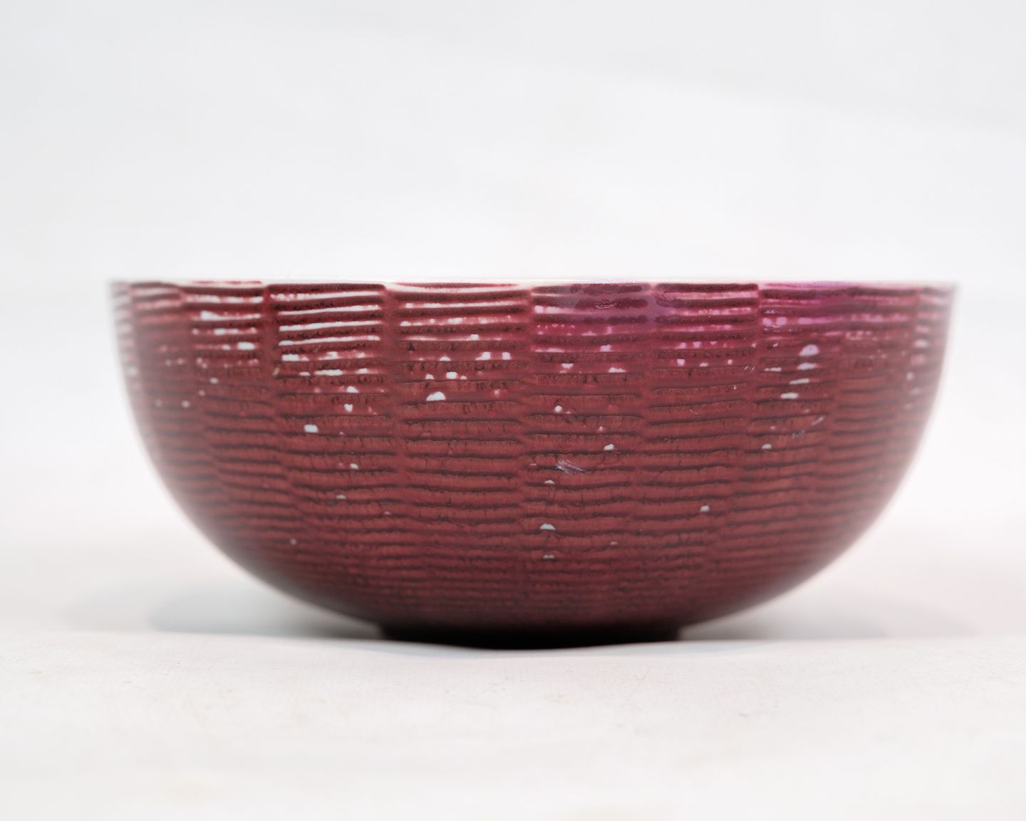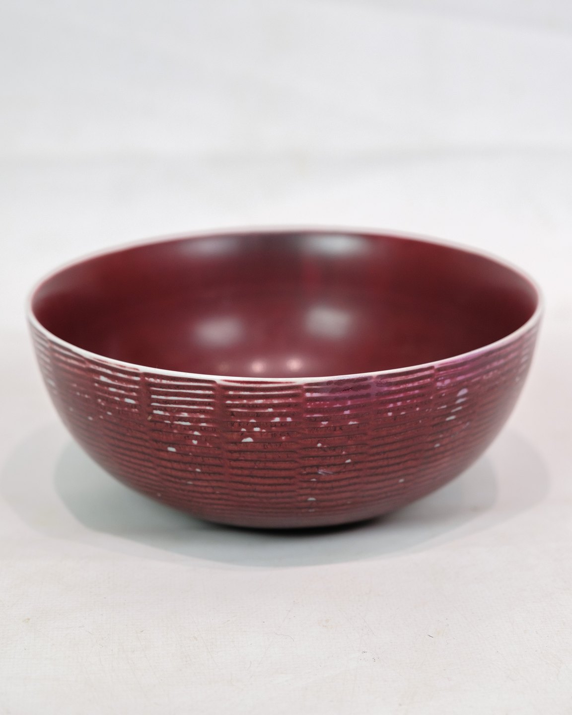 Keramikschale, Modell 20.717, mit ochsenblutfarbener Glasur, entworfen von Axel Salto für Royal Copenhagen. Die Schale ist ein klassisches Beispiel für Saltos experimentellen Ansatz in der Keramik, bei dem er zahlreiche unterschiedliche Glasuren einsetzte, um tiefe und satte Farbtöne zu erzeugen.