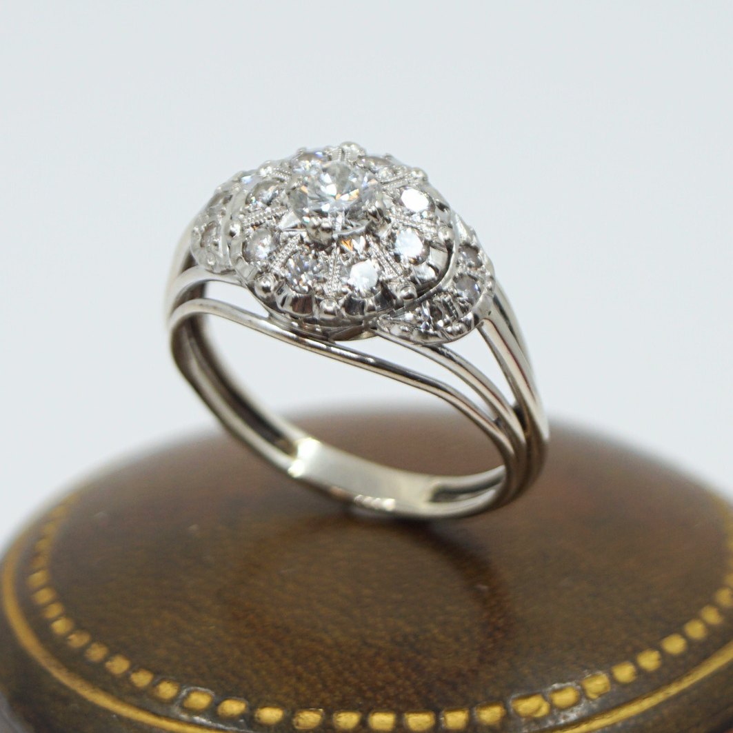 |  Text zugänglich auf Dänische: Viggo Wollny; Art deco diamantring i 14 kt. hvidguld med diamanter, i alt ca. 0,52 ct. Farve: Wesselton. Klarhed: VS. Ring str. 54. Omkring 1940 - 1950. Stemplet "585 VW". Viggo Wollny,