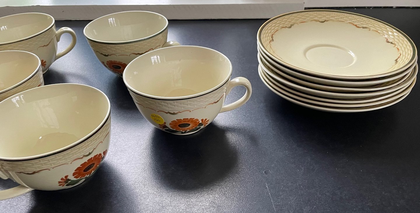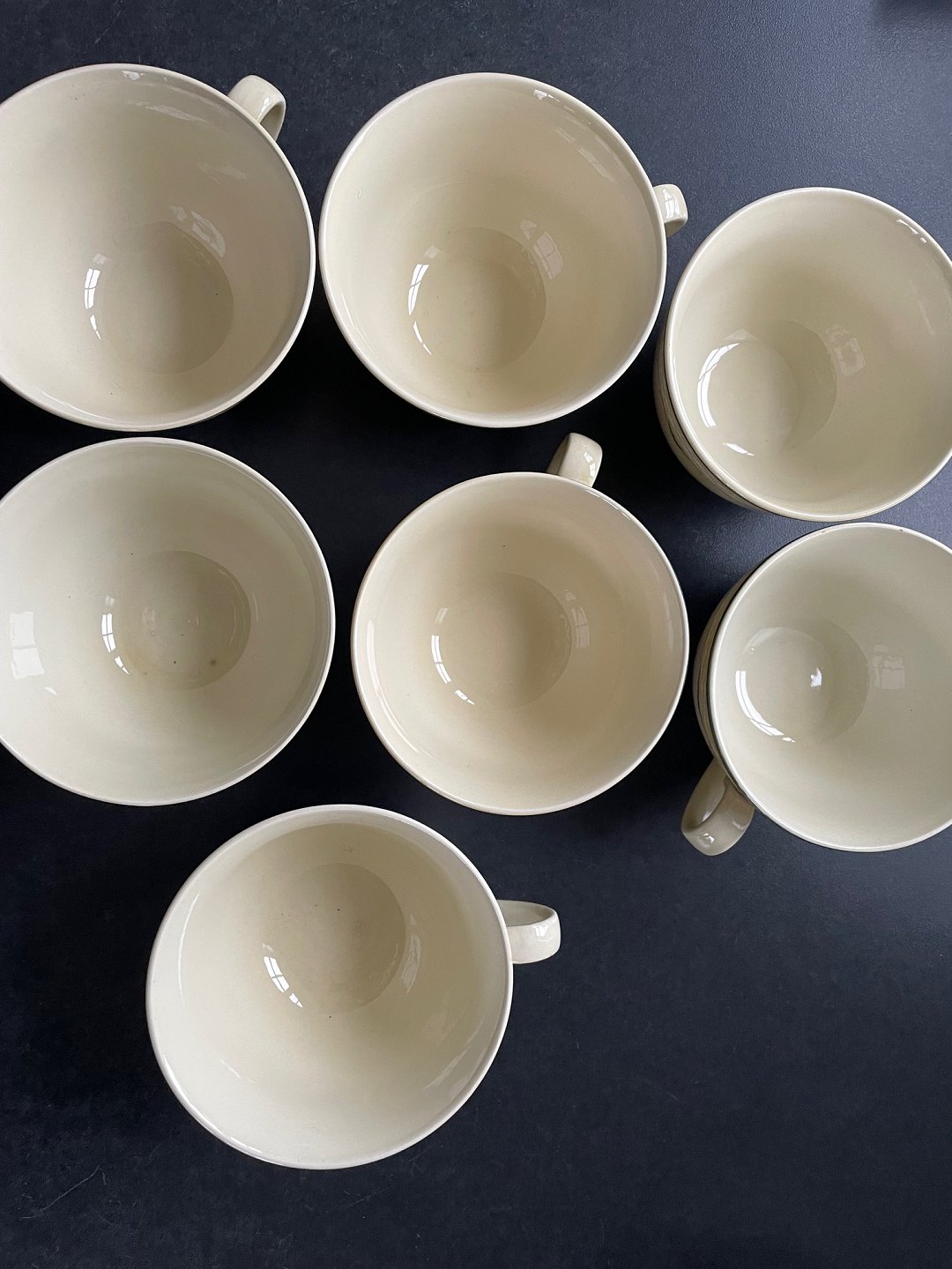 Text zugänglich auf Dänische: Aluminia, Morgenfrue. Designet af Niels Thorsson. Produceret i perioden 1934-1967. Luftmalet. Tekop. Nr. 1782. Højde 5,5 cm. Diameter 9,5 cm. Underkop diameter 15 cm. Flot stand. Pris: 150 kr. stk. Lager: 7