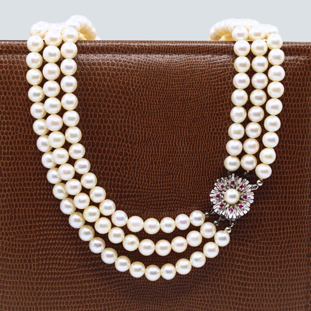 Text zugänglich auf Dänische: Treradet perlekæde prydet med rubinlås i 14 kt. hvidguld
