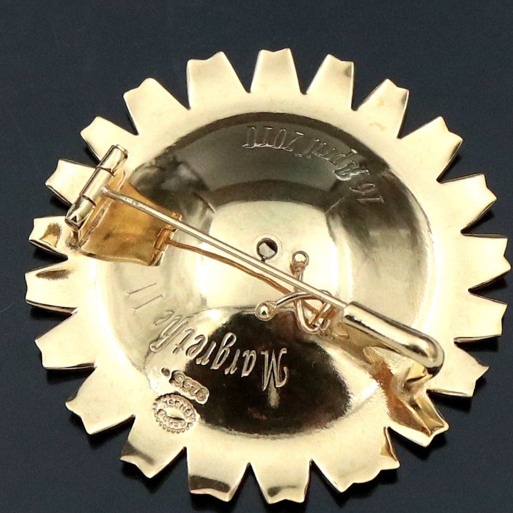 Text zugänglich auf Dänische: Georg Jensen Marguerit / Daisy Broche / Vedhæng i forgyldt sterling sølv med blå emalje - 50mm.