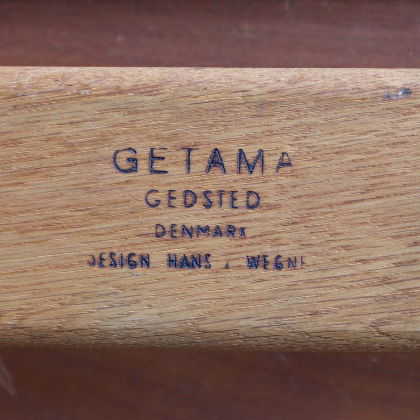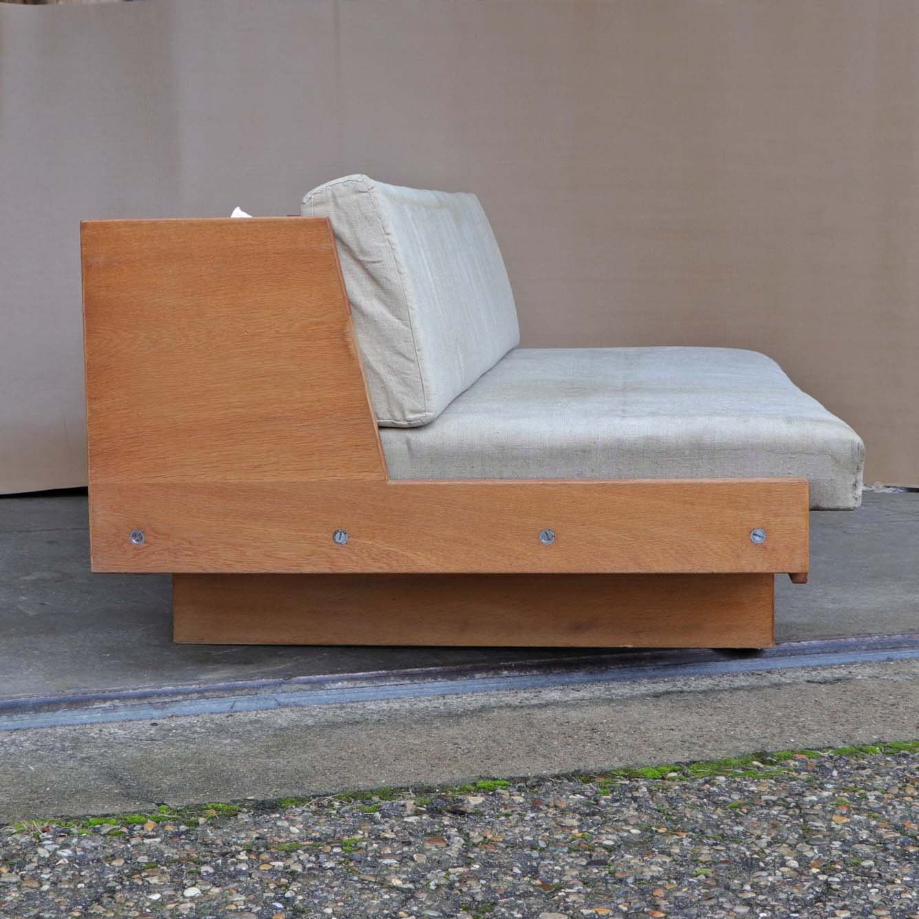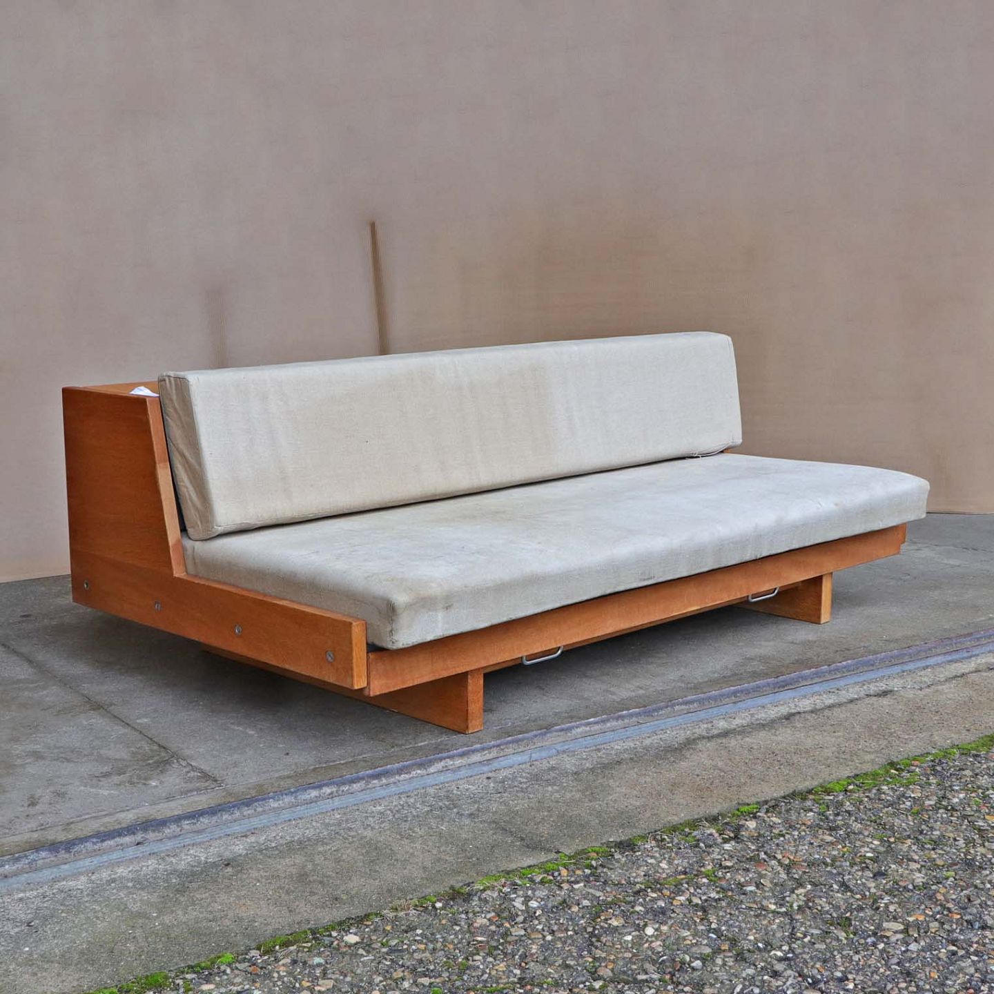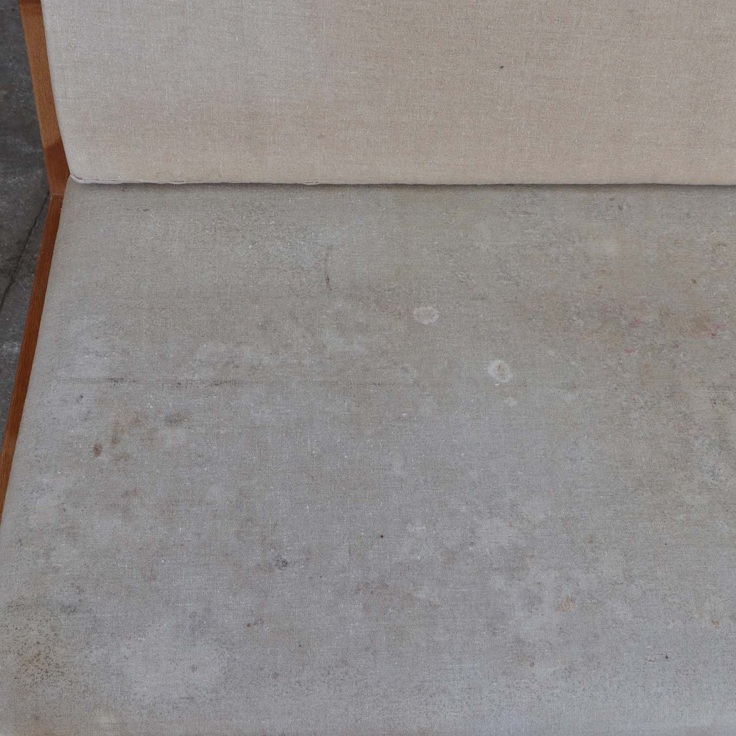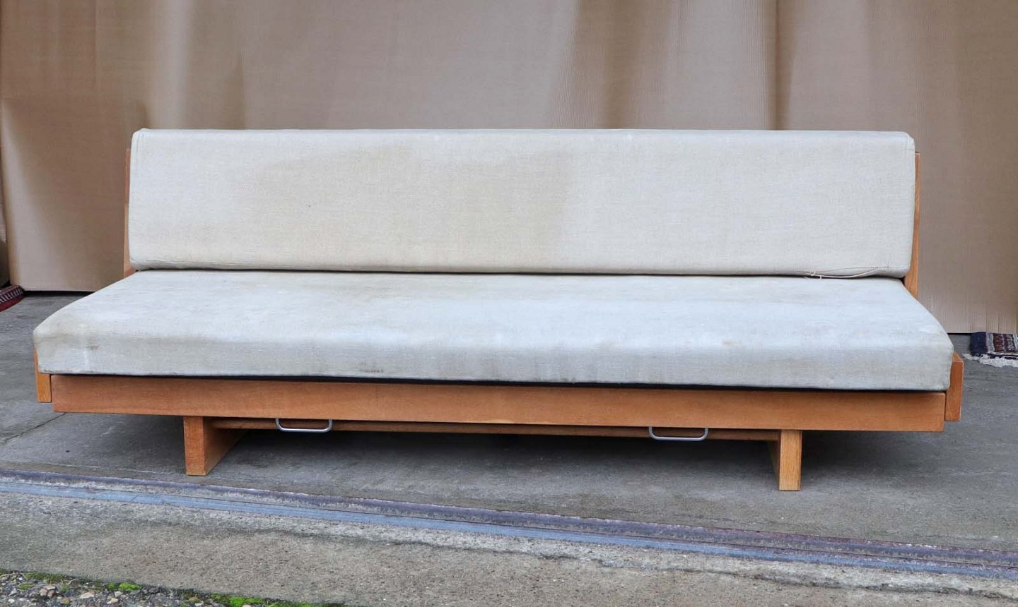 Text zugänglich auf Dänische: Tre personers sofa med sove-udtræk og stel i lakeret egetræ. Sæde og ryghynde er med springfjeder og betrukket med lyst canvasstof. Møblet er en sovesofa, som udtrukket kan rumme to personer. Model GE-77