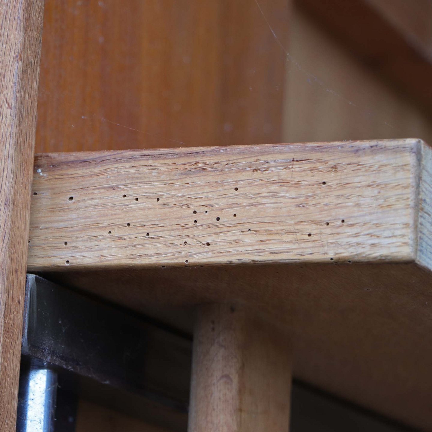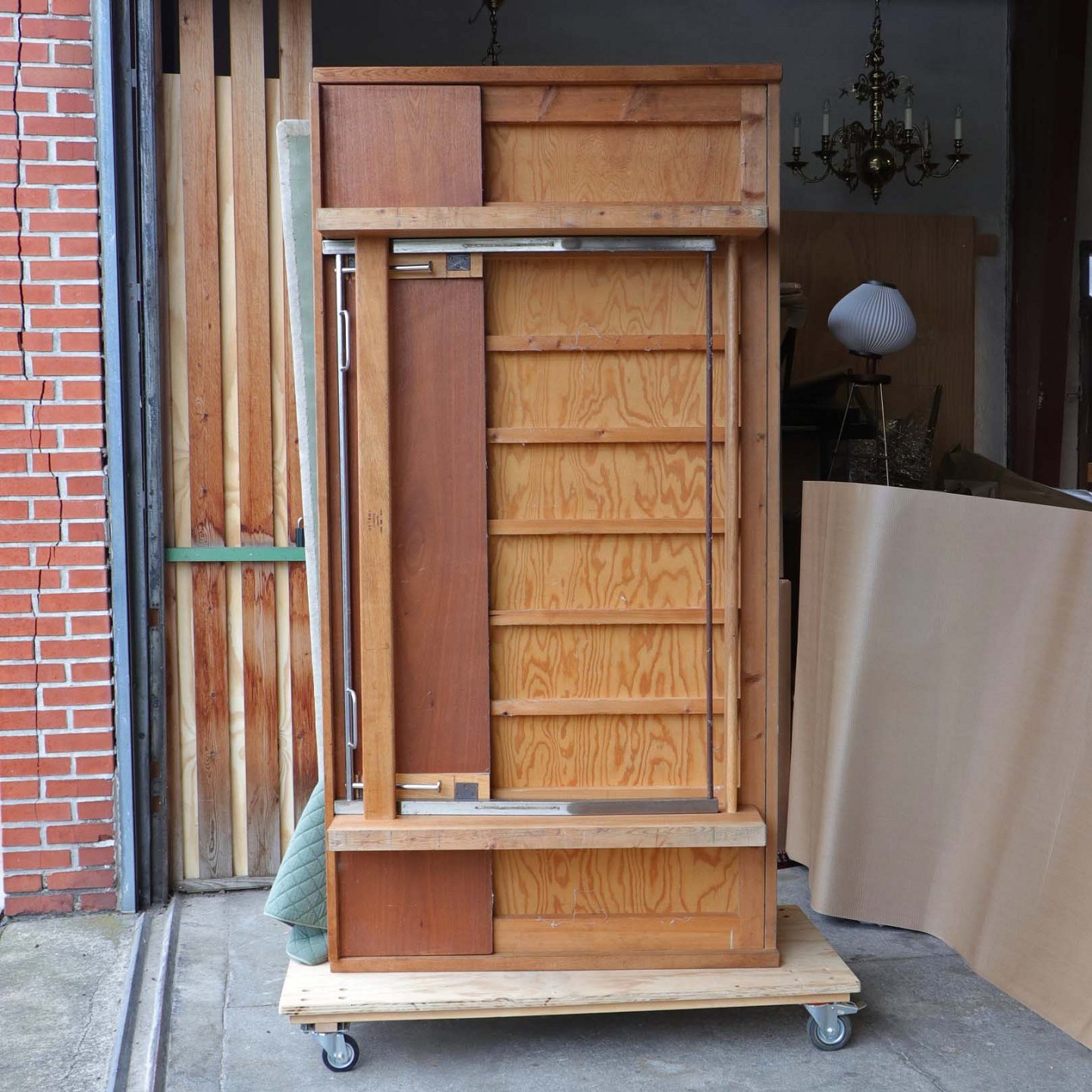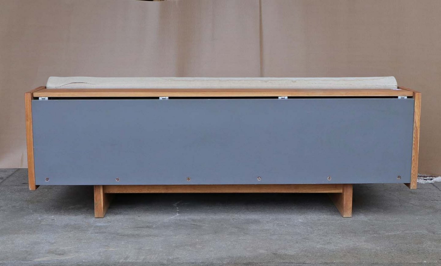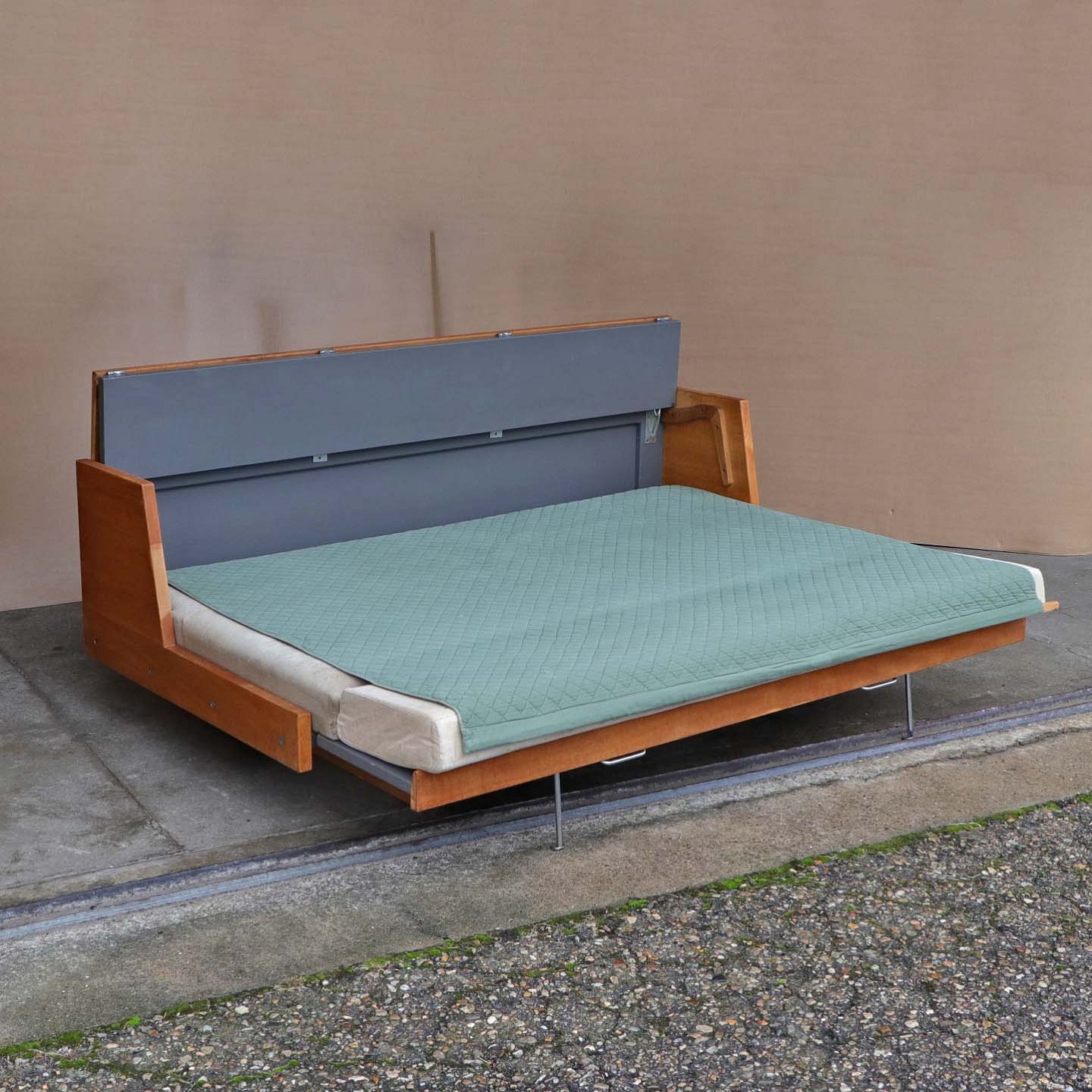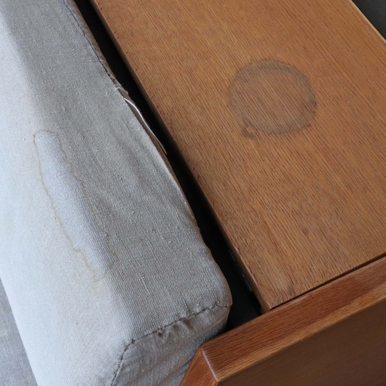 Text zugänglich auf Dänische: Tre personers sofa med sove-udtræk og stel i lakeret egetræ. Sæde og ryghynde er med springfjeder og betrukket med lyst canvasstof. Møblet er en sovesofa, som udtrukket kan rumme to personer. Model GE-77