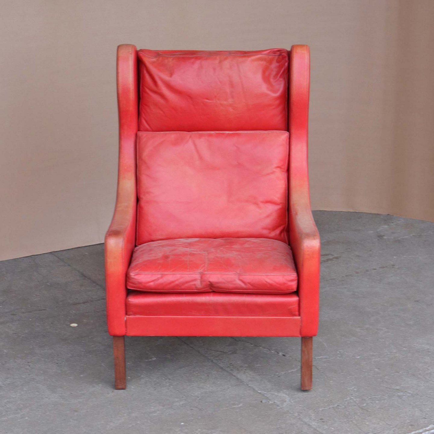 Text zugänglich auf Dänische: Lænestol med høj ryg og stel i mørk lakeret træ. Stolen betrukket med orangerødt patineret læder
