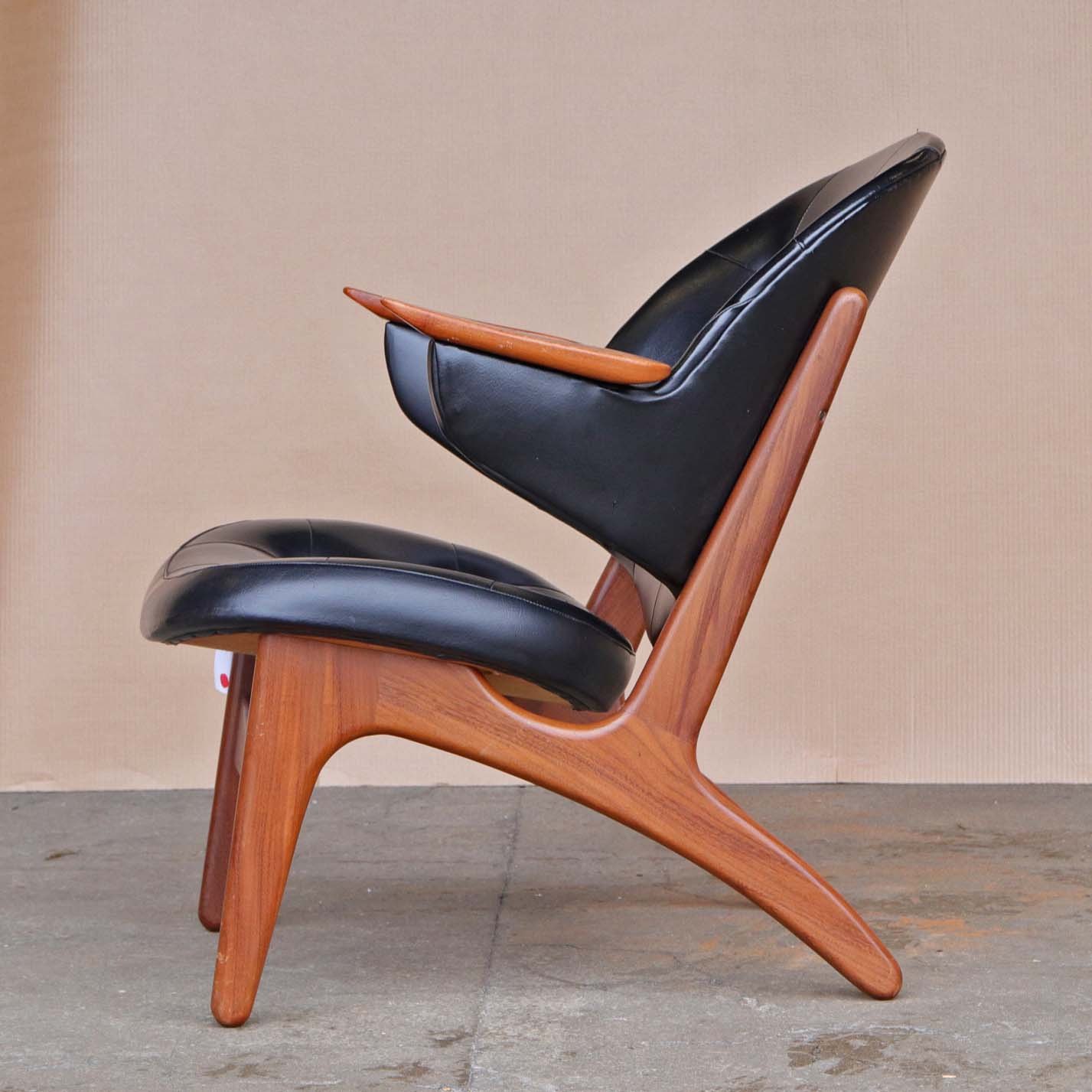 Lænestol fra 1960'erne med stel i lakeret teaktræ og armlæn i egetræ. Stolen betrukket med sort imiteret læder. Model 33