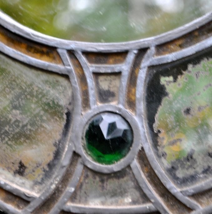 Ovalt spejl, jugend, ca. 1900, Danmark. Med indlagt farvet glas og grønne glas flusser. H.: 35 cm. B: 30 cm.