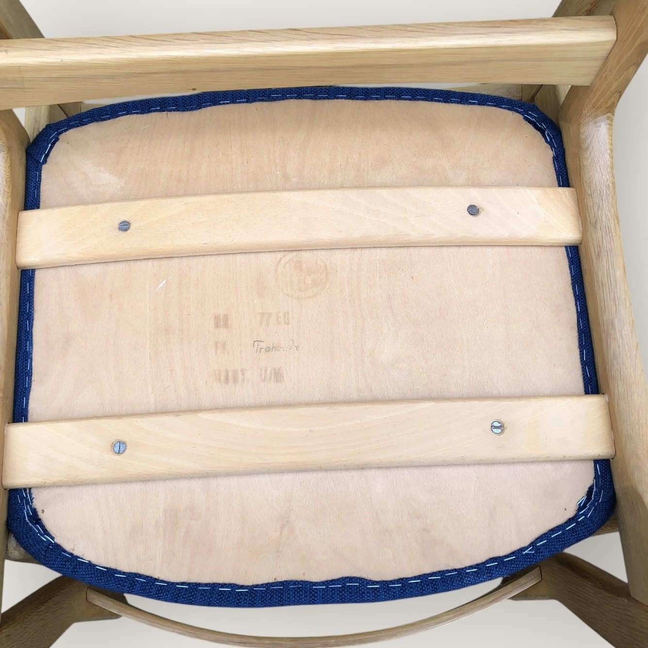 4 Stühle aus heller Eiche mit Stoffsitzen, dänisch modern aus den 1960er Jahren, erscheinen in schönem und stabilem gebrauchten Zustand mit wenigen Gebrauchsspuren.