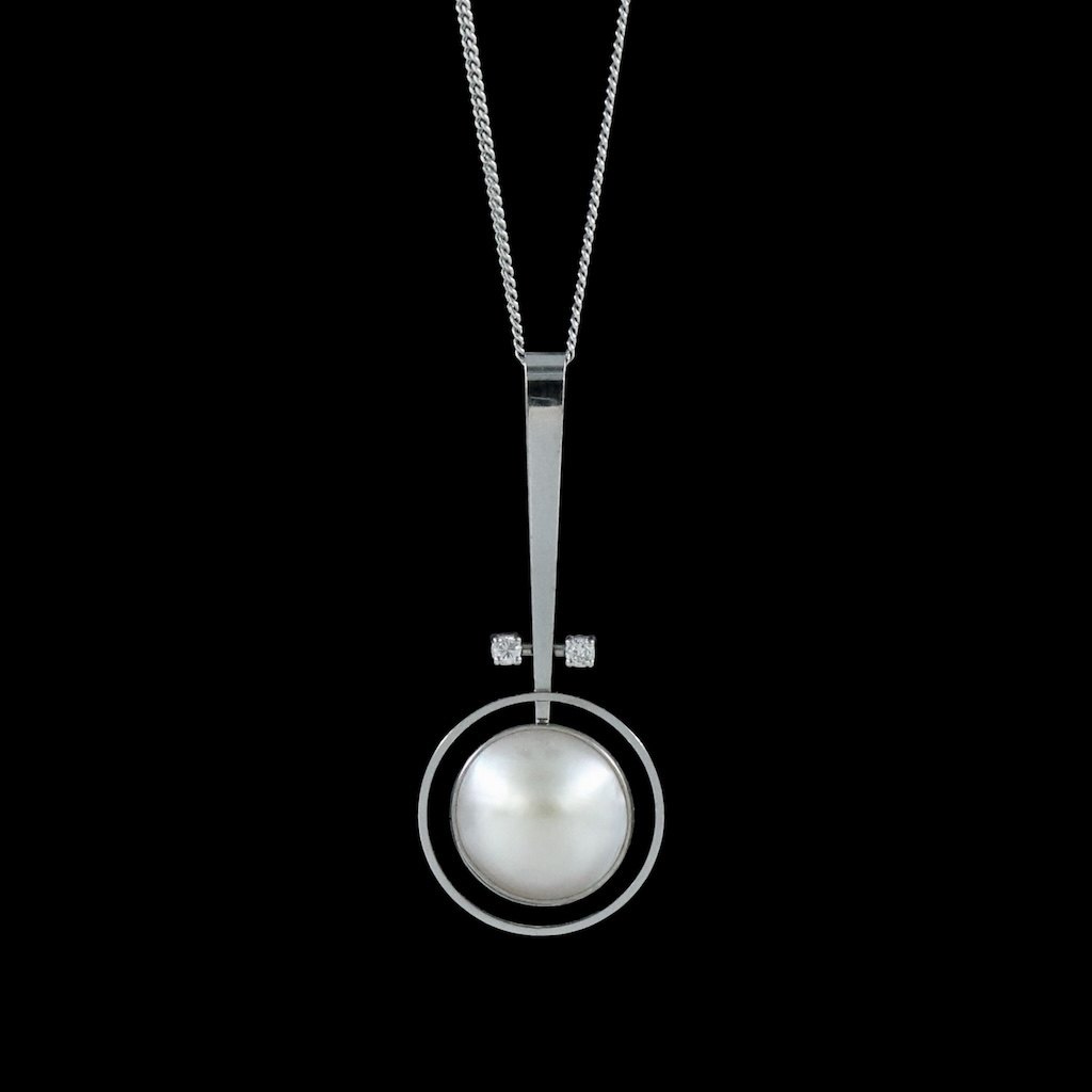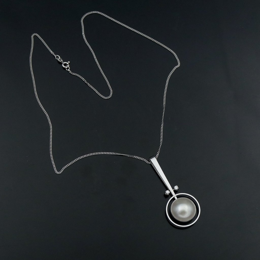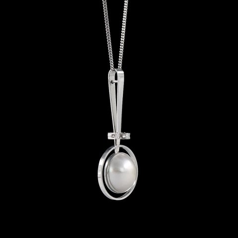 Text zugänglich auf Dänische: Bræmer-Jensen Vedhæng i 14k hvidguld med perle og brillanter.