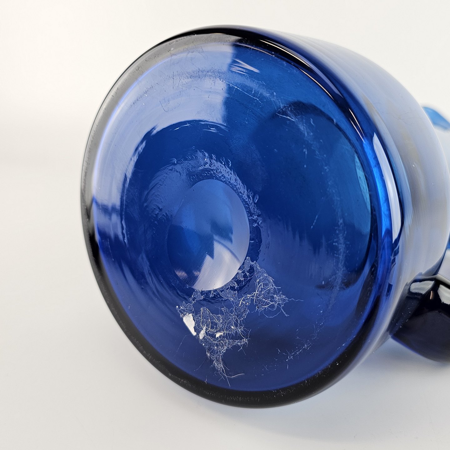Høj slank Capri kande i blåt transparant glas, håndtaget sidder skråt for tuden.