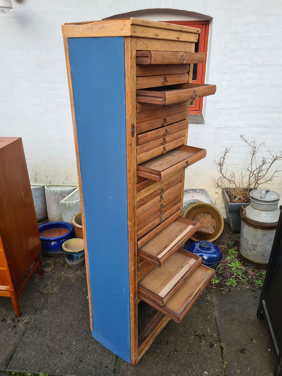 Text zugänglich auf Dänische: Arkivmøbel med skuffer udført i delvis bemalet fyr.