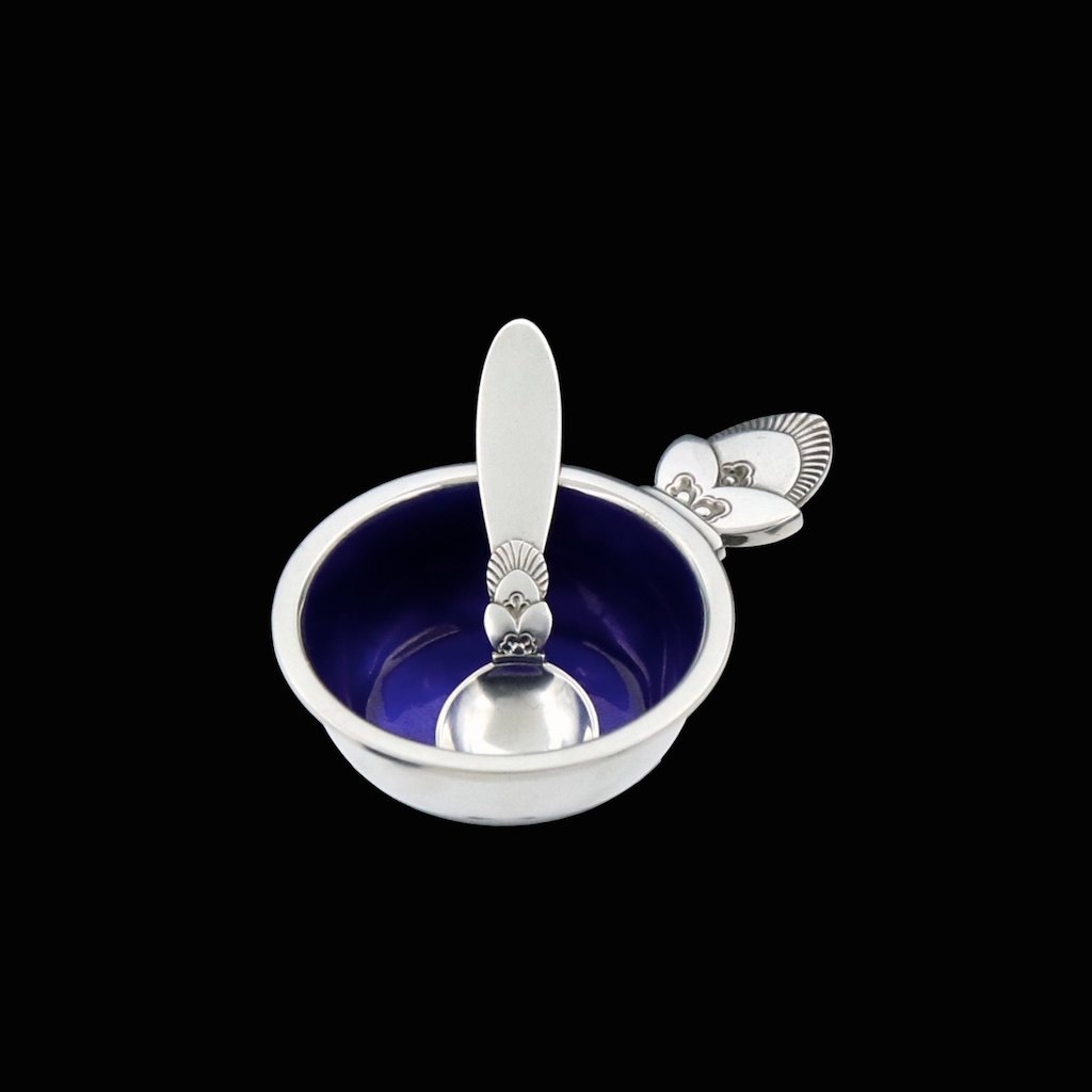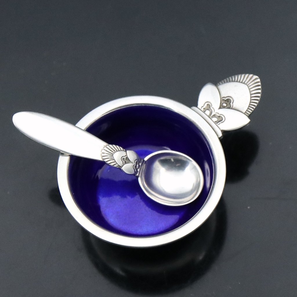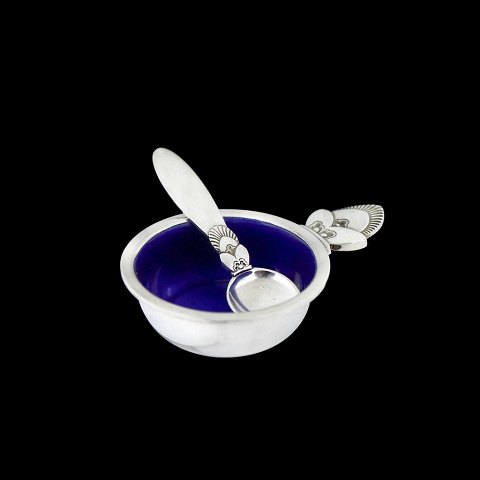 Georg Jensen. Saltkar #102 i sterling sølv med blå emalje med tilhørende ske 103 - Kaktus.