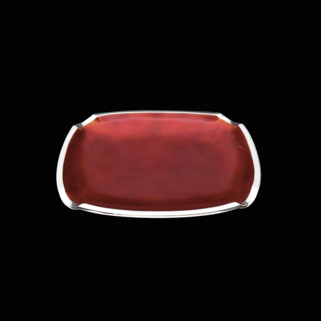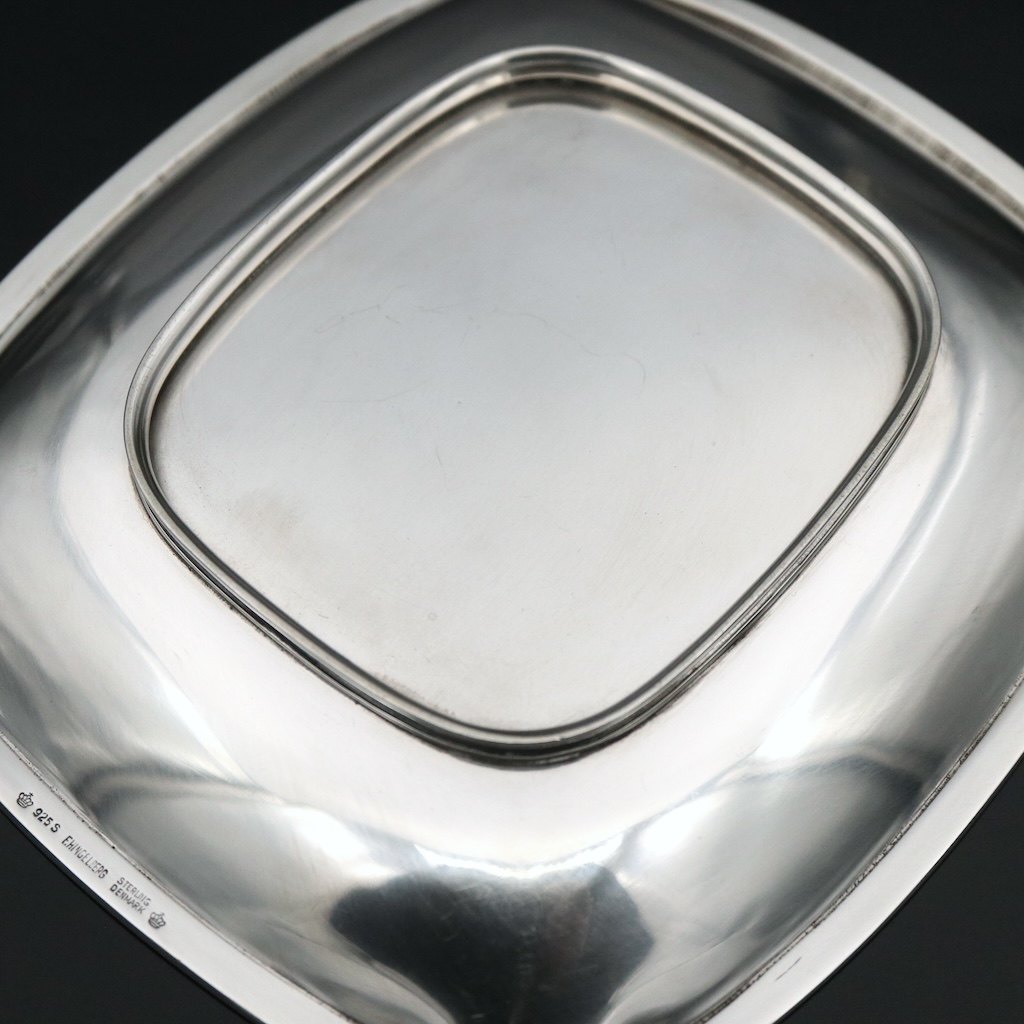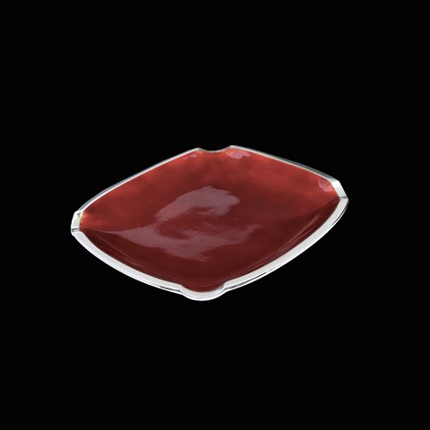 Text zugänglich auf Dänische: Svend Weihrauch 1899-1962 for F. Hingelberg. Bakke i sterling sølv med rød emalje.