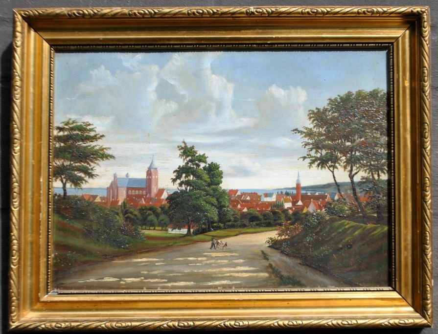 Holm, Peter (1798 - 1875) Dänemark: Aarhus im Süden mit der Kathedrale und der Abteikirche. Öl auf Metallplatte. Ohne Vorzeichen. 25 x 35 cm. Gerahmt: 32 x 42 cm. Die Stadt ist hier von der Munkegade vor dem Stadttor aus zu sehen. Der Künstler hat viele Broschüren über Aarhus angefertigt, aber soweit bekannt ist, ist dieses Werk das einzige mit diesem Motiv!